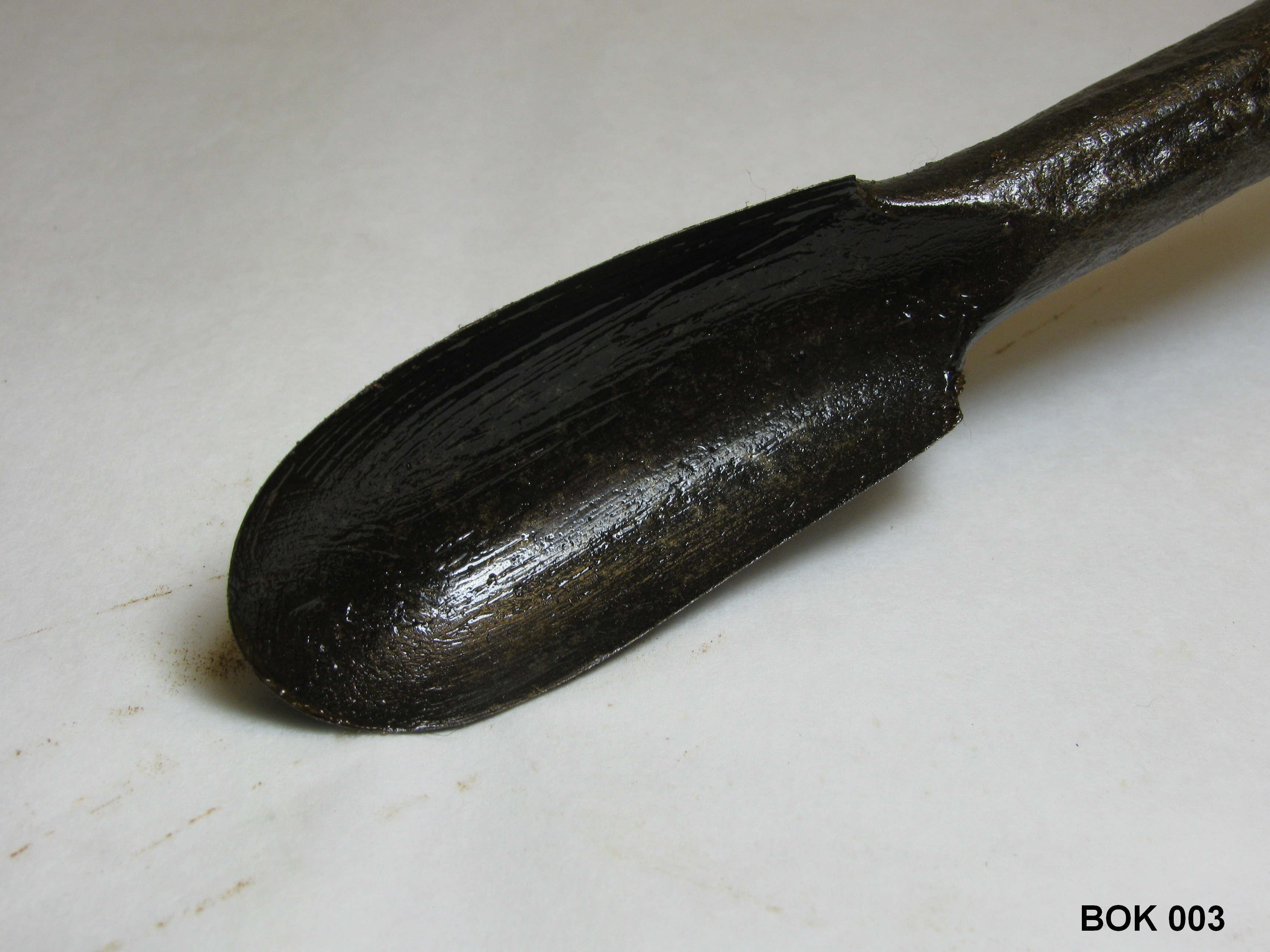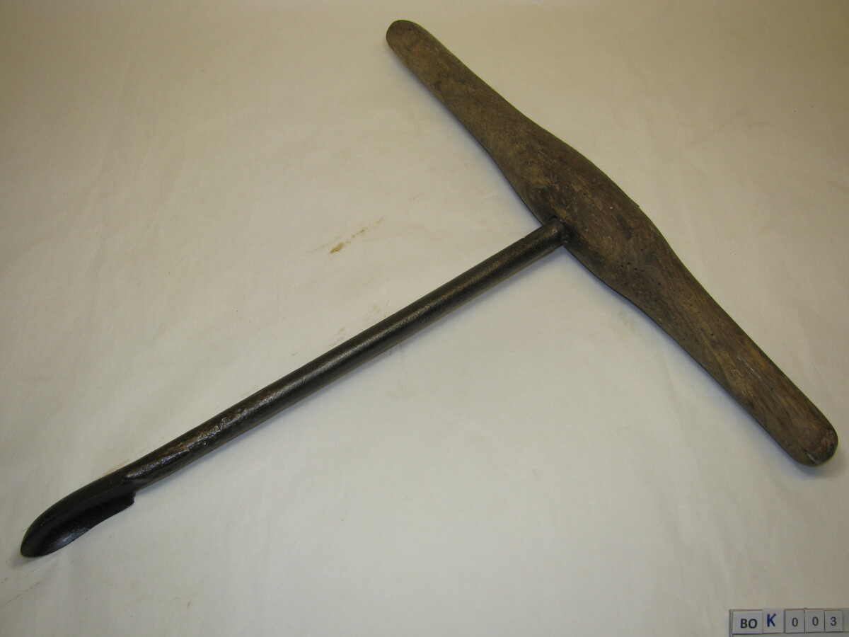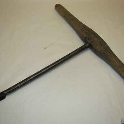 Lange ijzeren steel met langgerekte boor. Met fors houten handvat. Op steel: ww. Zwart, bruin.