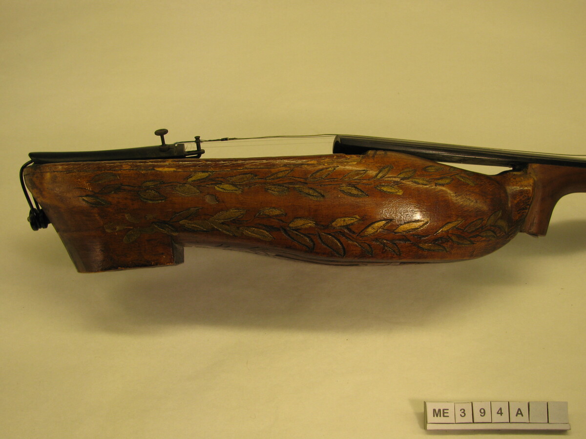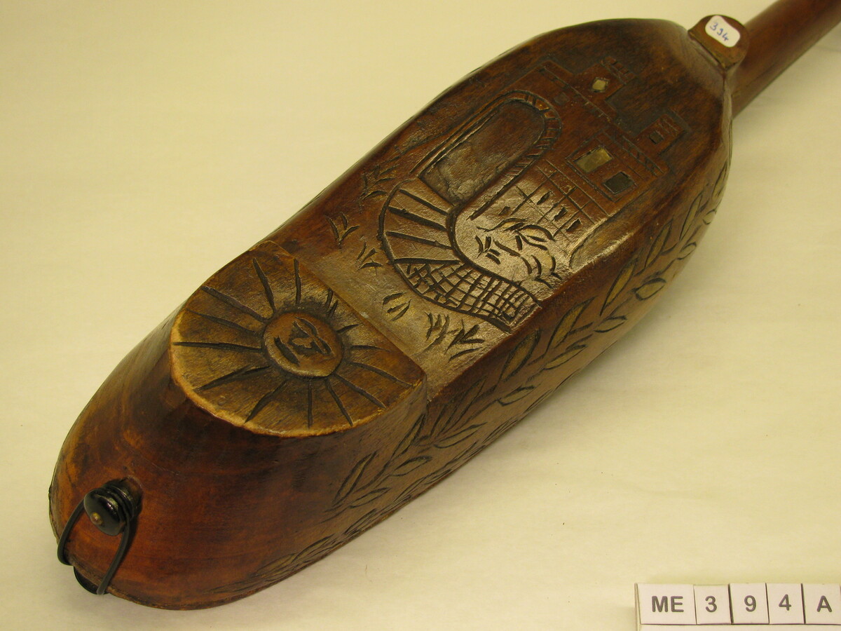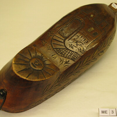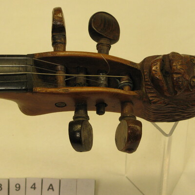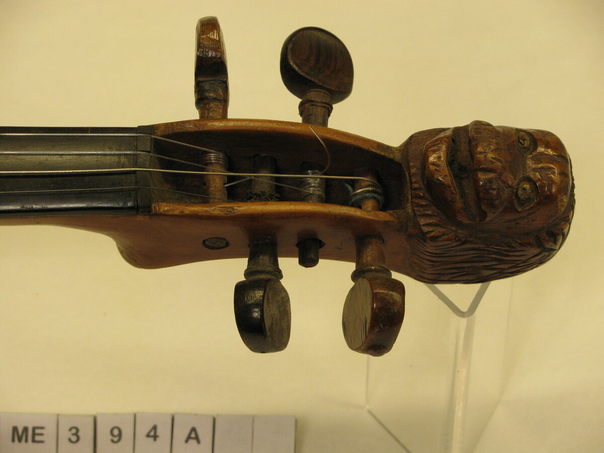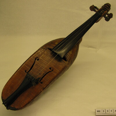 Gesloten klomp, dient als klankkast, neus is verlengd als hals van de viool eindigend in een apenkop (uitgesneden). Vier snarren met spanknoppen. Ritsversiering: bladeren. Op onderzijde: afbeelding kasteel met raampjes van parelmoer. Op de hak: de zon. Kleur: Bruin en zwart.