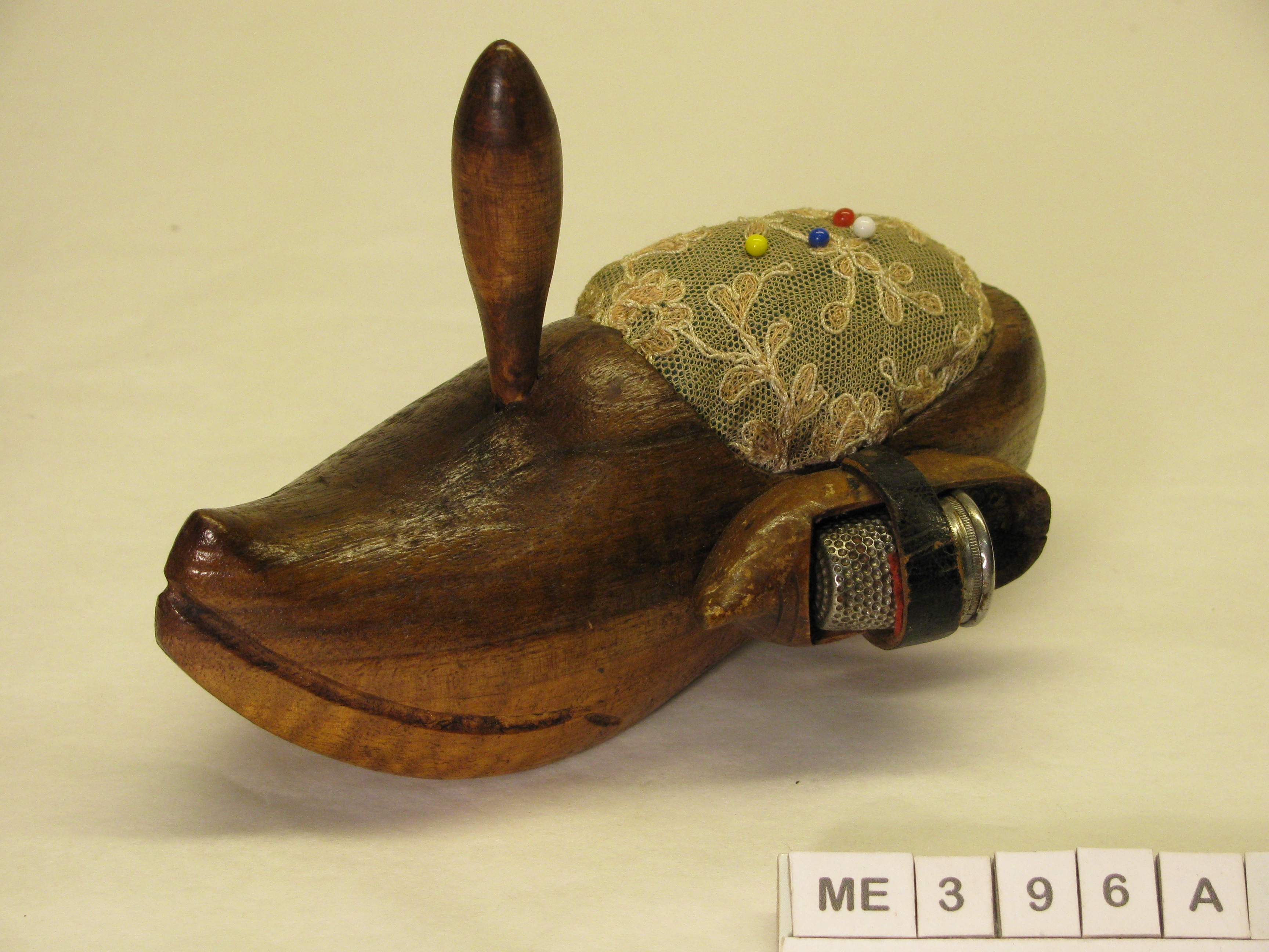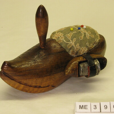 Klompje met speldenkussen en handgreepje op de kap. Aan zijkant kleinerklompje met vingerhoed. Kleur: Bruin.