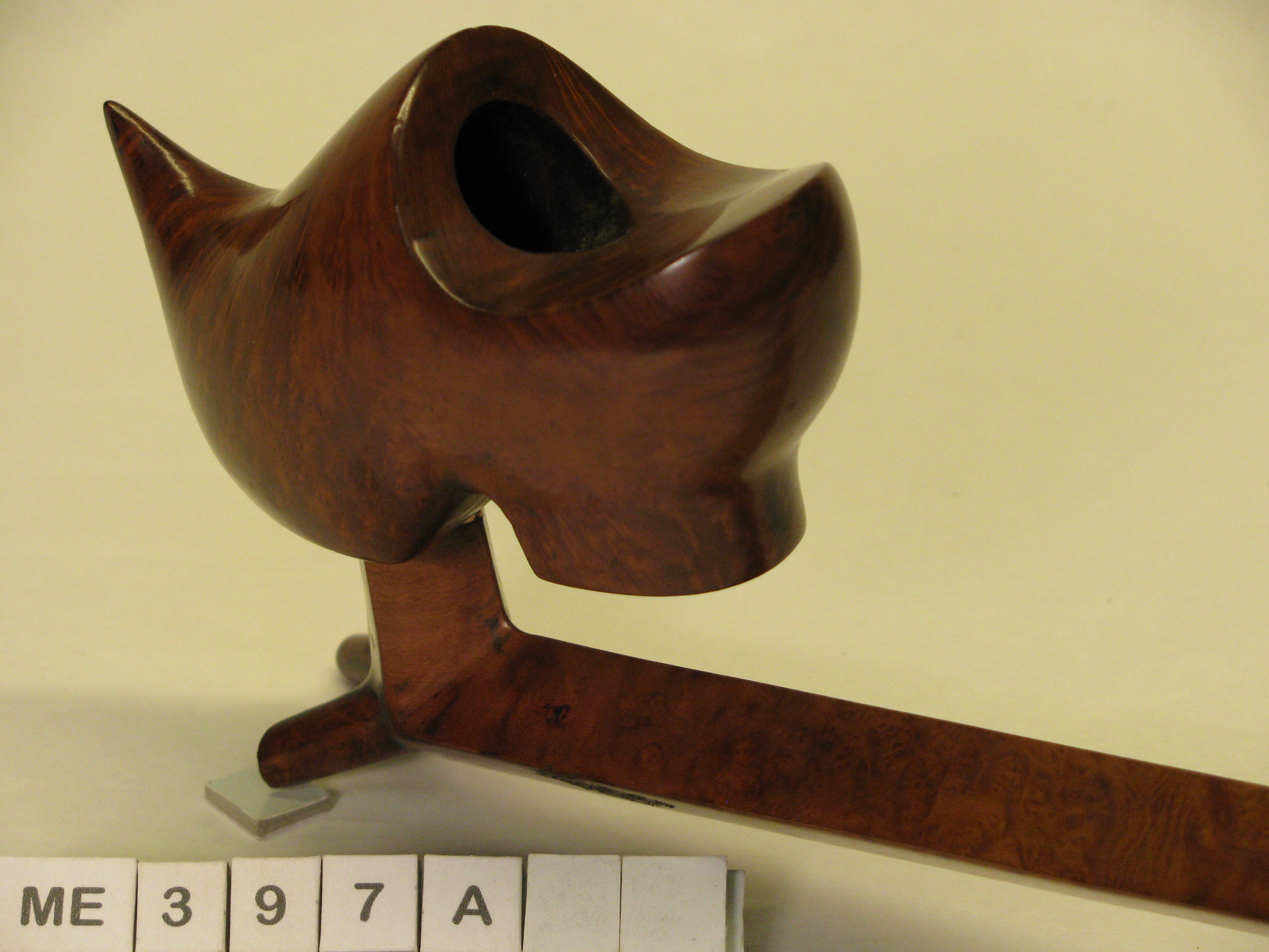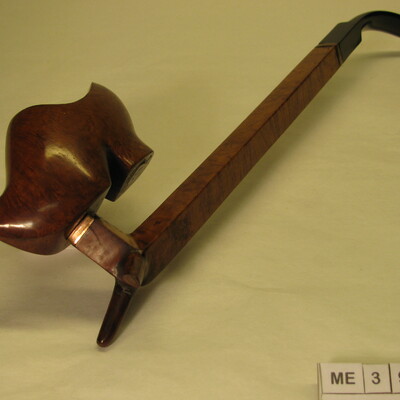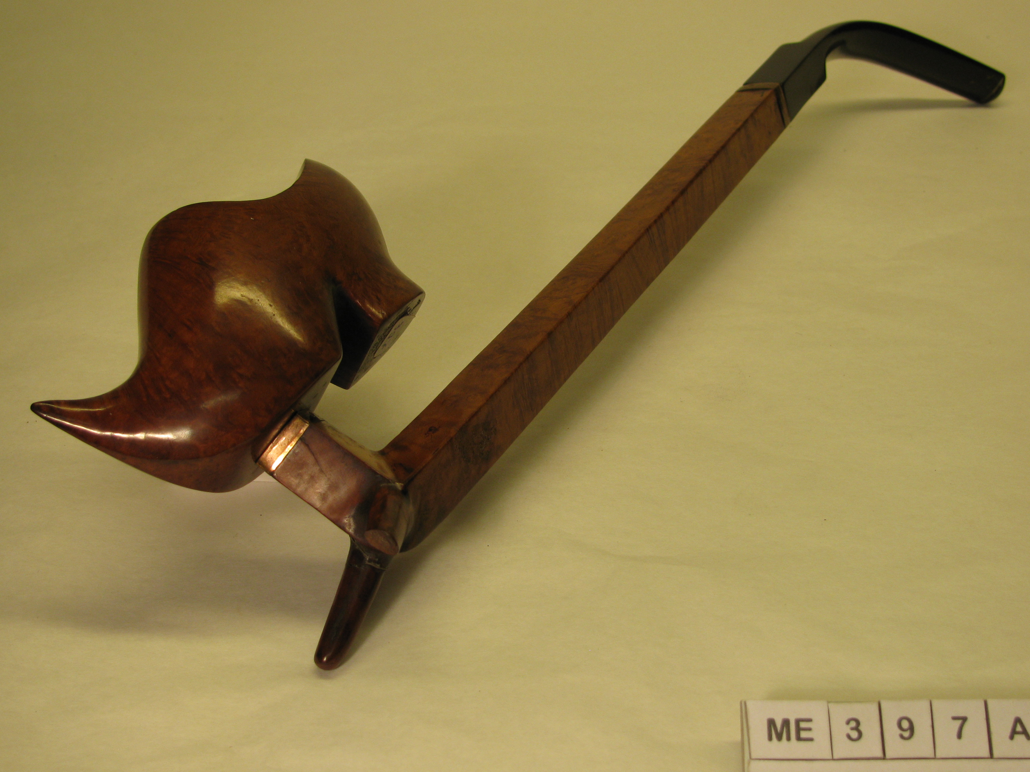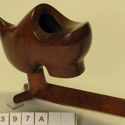 Pijp met kop in vorm van klomp, bedekt, opgaande spitse neus uitlopend in punt, met hak. Steel lang en hoekig met steun puntjes, die afgebroken zijn.. Bochtig mond, stuk, met schroefdraad eraangezet met ivoren draad. Koperen bandjes aan begin + eind van steel. Kleur: Blank gelakt, zwart. Ca. 1925.
