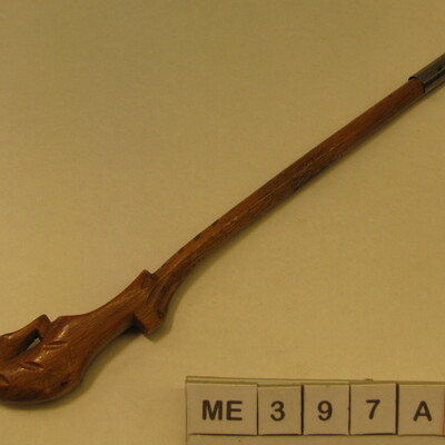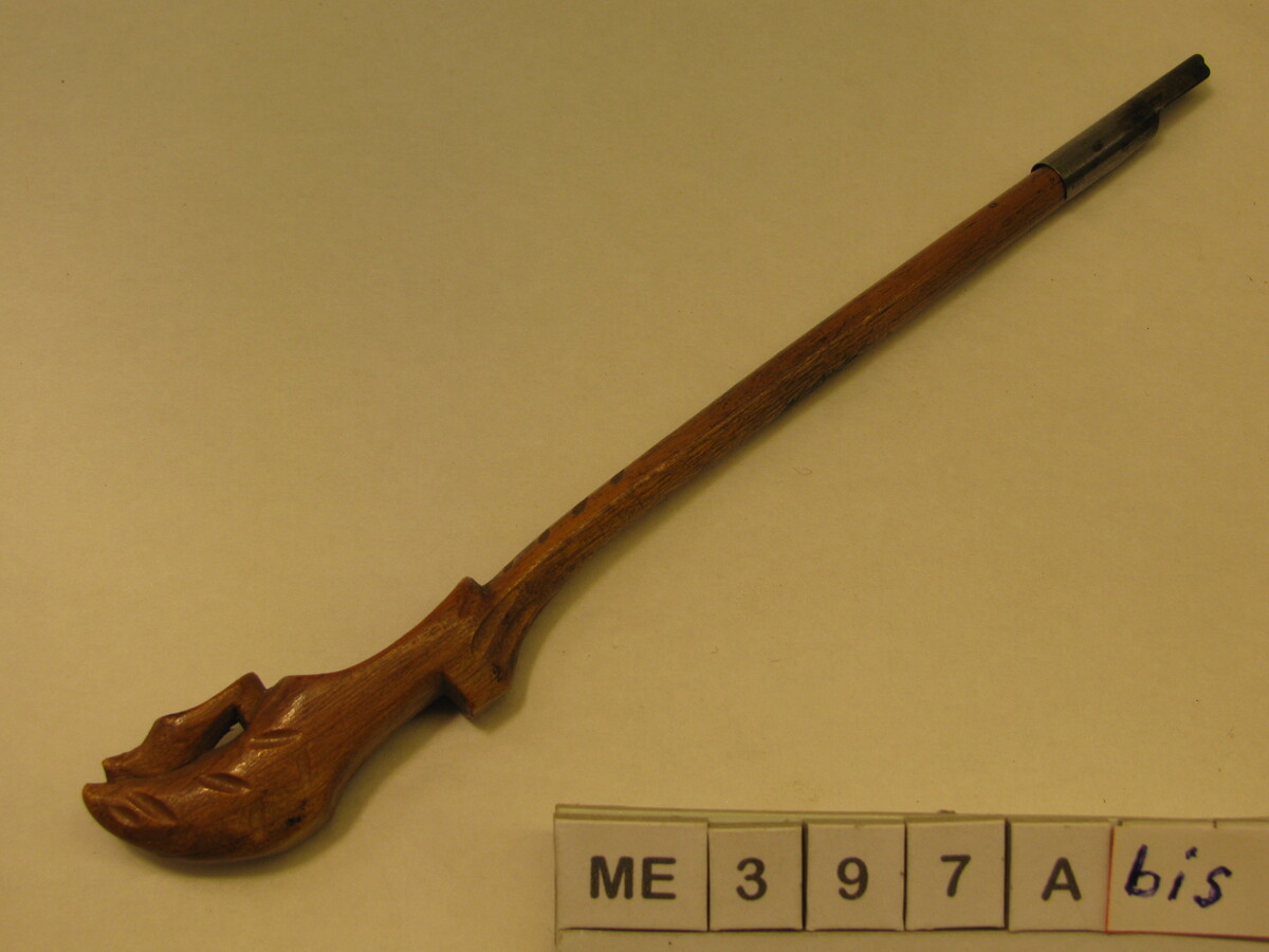 Klompje met op de kap een andere klein klompje. Aan de hak , lange steel met aan het eind metalen hulsje om een pennetje vast te zetten. Tekst op steel: "Saltes". Kleur: Blank gelakt.