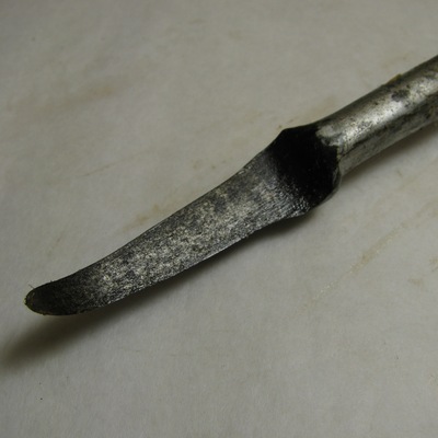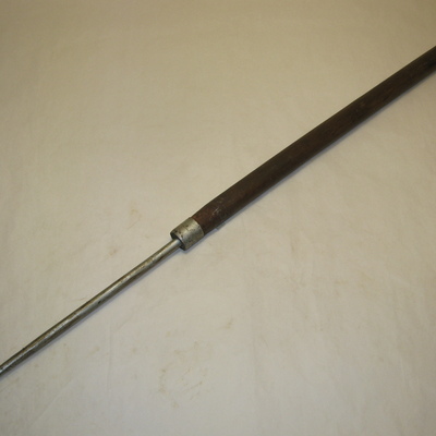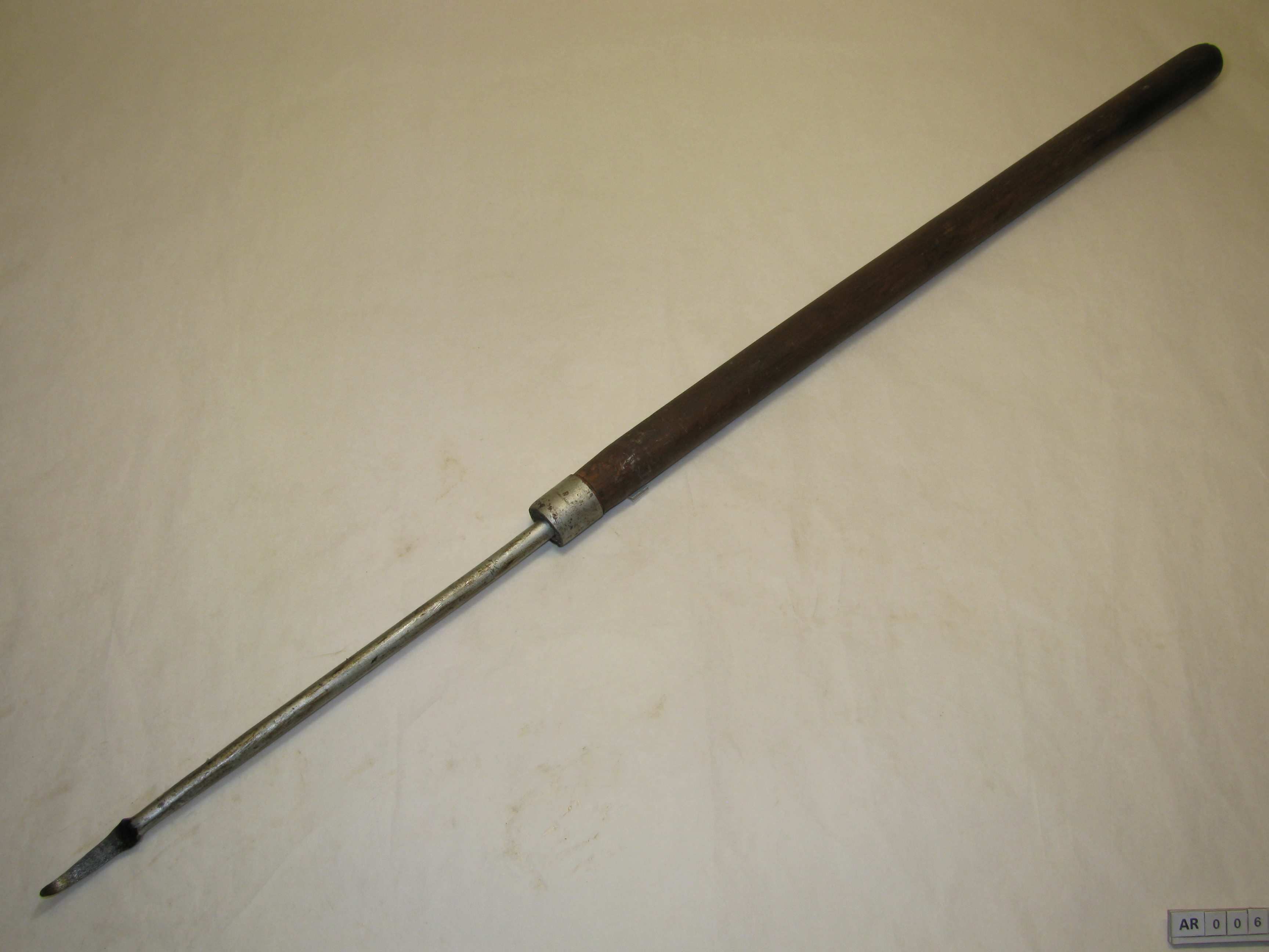 IJzeren stang met klein driehoekig, tweezijdig snijdend mes, met lange houten steel met ijzeren ring. Zilver, bruin.