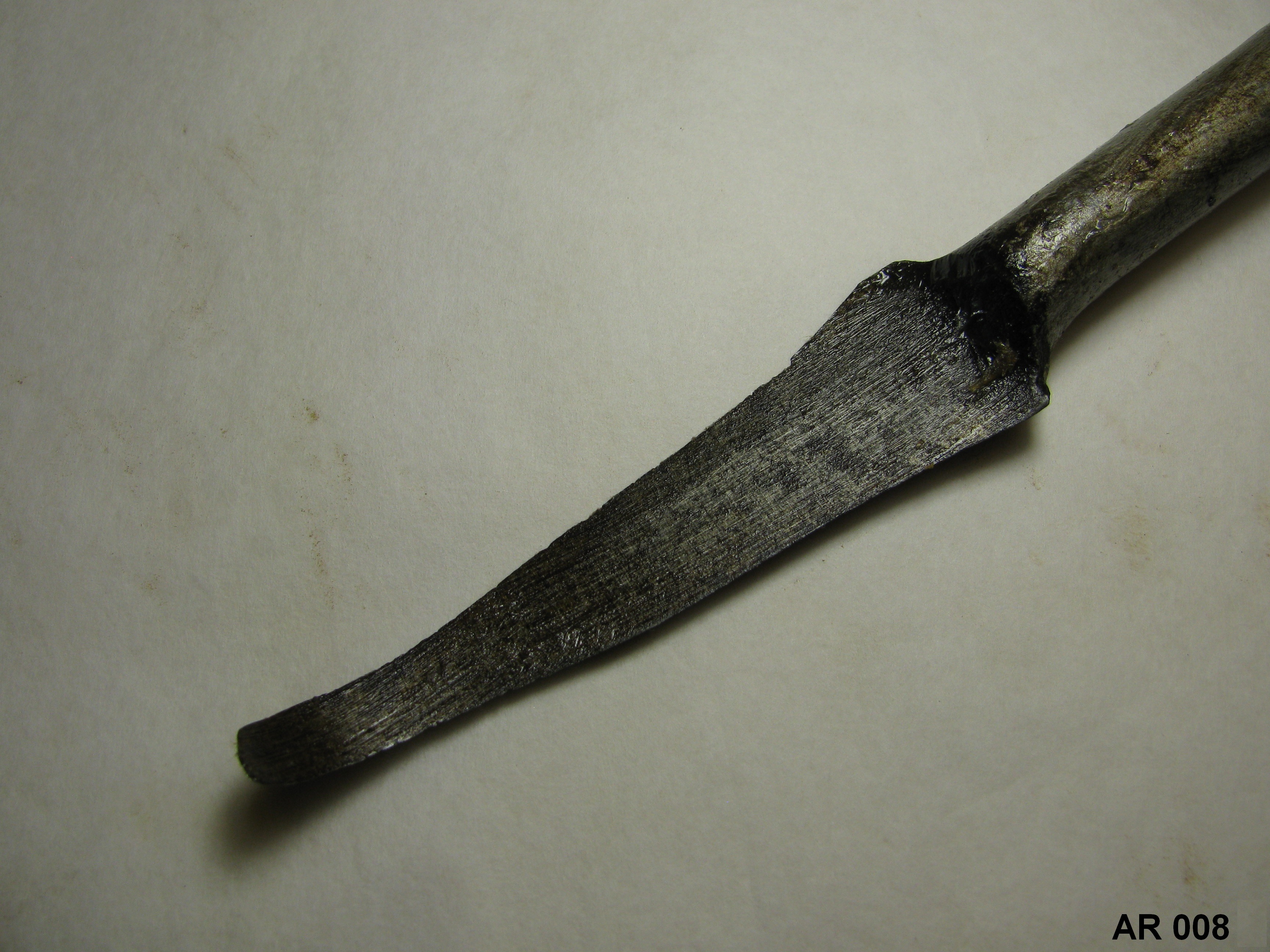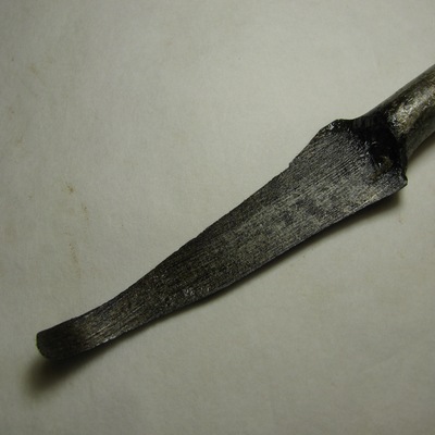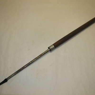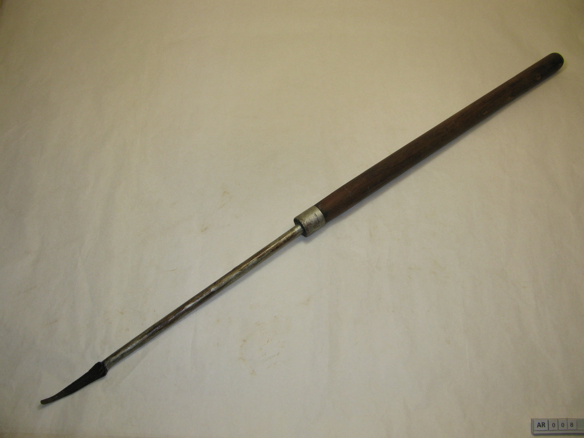 Ronde ijzeren steel met driehoekig, tweezijdig snijdend mes, punt iets gebogen. Lang houten handvat met ijzeren ring. Zilver, bruin.