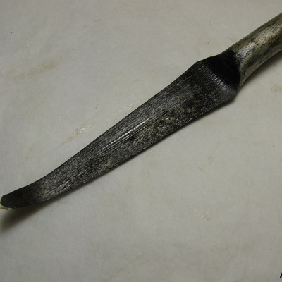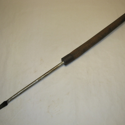 Ronde ijzeren steel met driehoekig, tweezijdig snijdend mes, puntje iets gebogen. Met lang taps toelopend houten handvat met ijzeren ring. Bruin, zilver.