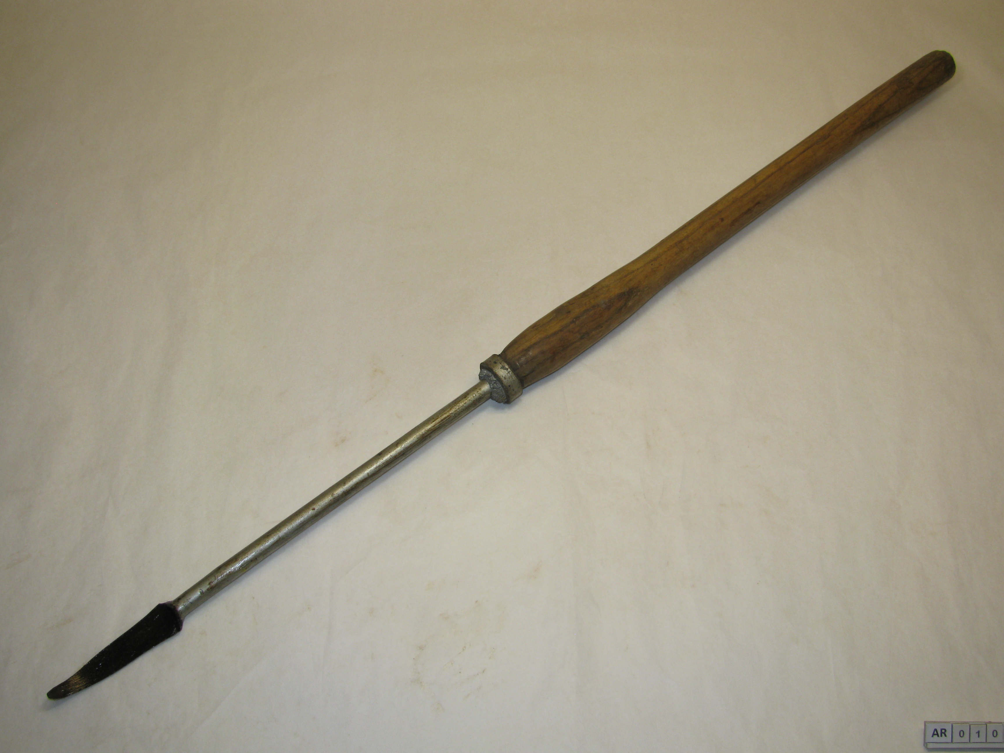 Ronde ijzeren steel met tweezijdig snijdend mes, puntje gebogen. Met lange, taps toelopende houten steel met ijzeren ring. Zilver, bruin.