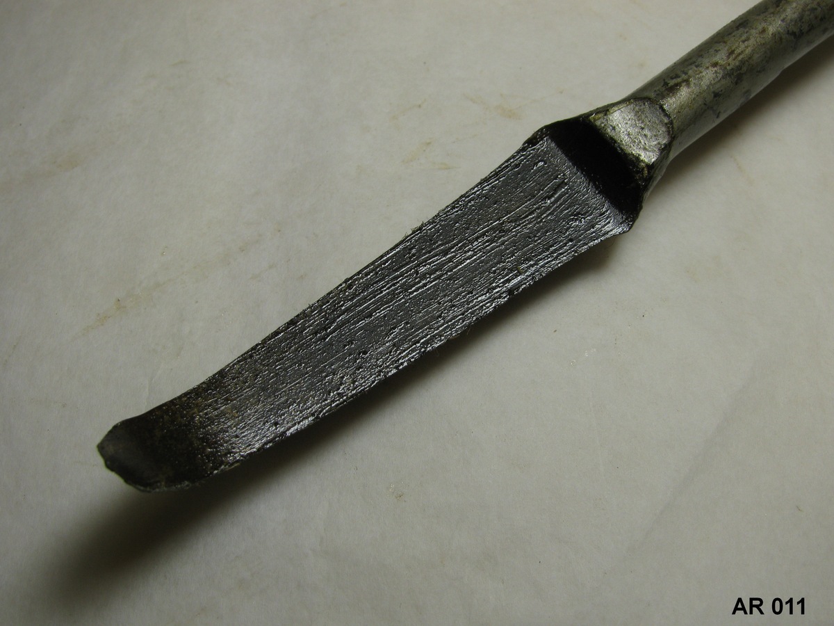 Ronde ijzeren steel met taps toelopend, tweezijdig snijdend mes (driehoeksvorm). Met lang houten handvat met ijzeren ring, taps toelopend. Zilver, bruin.