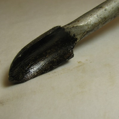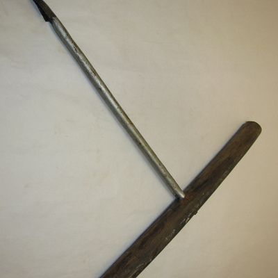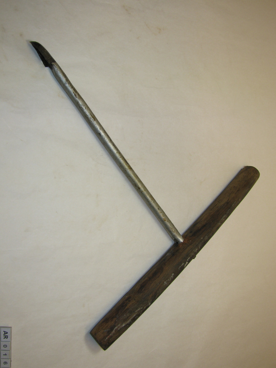 Ronde ijzeren stang met kleine lepelboor en houten handvat. Zilver, bruin.