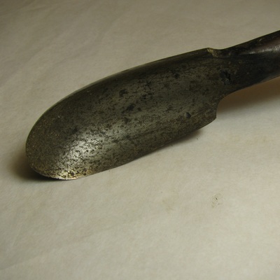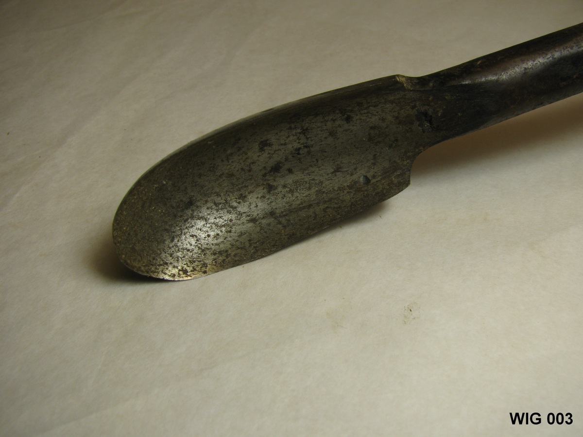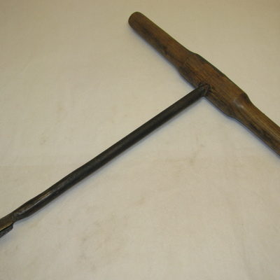 Ronde ijzeren steel met langwerpige lepelboor en houten handvat. Opschrift: EW 3. Zwart, bruin.