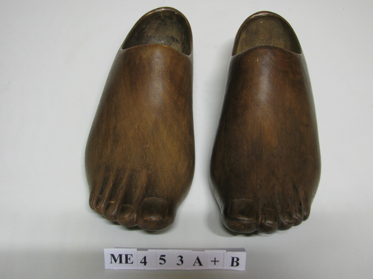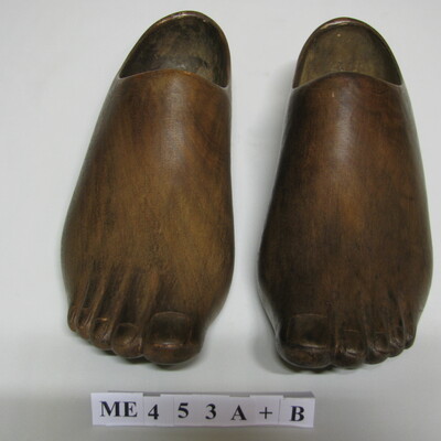 Modelklompen, voor vrouwen, bedekt, brede neus met snijwerk in de vorm van blote tenen, met hak. Kleur is blank gelakt.