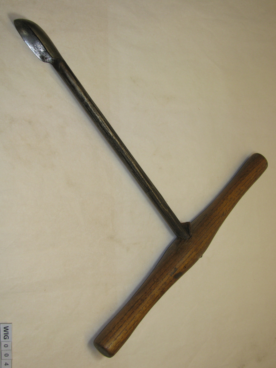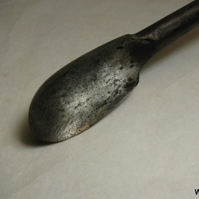 IJzeren steel met lepelboor en houten handvat. Steel is met stukje leer in het handvat vastgezet. Zwart, bruin.