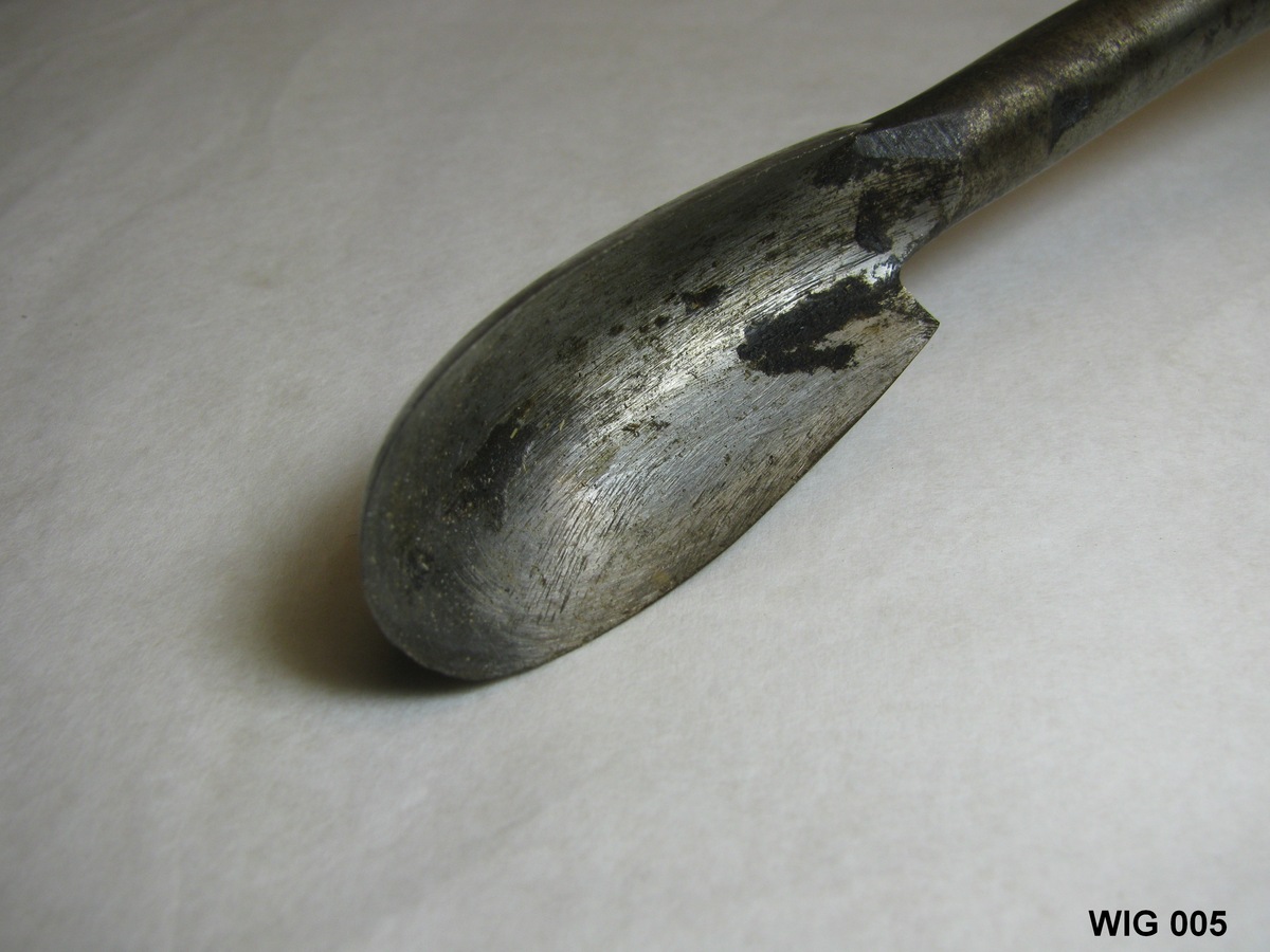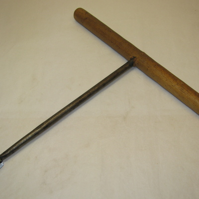 IJzeren stang met kleine lepelboor en recht houten rond handvat. Stang is met stukje dubbelgeslagen leer vastgezet. Opschrift: EW 5. Bruin, zwart.