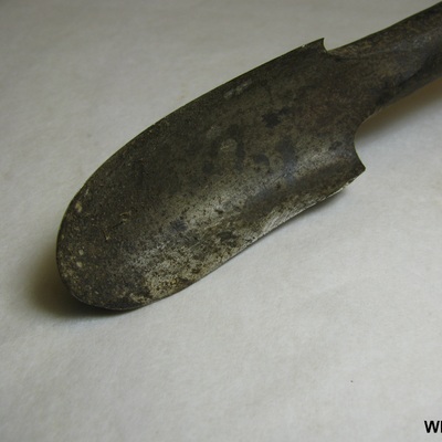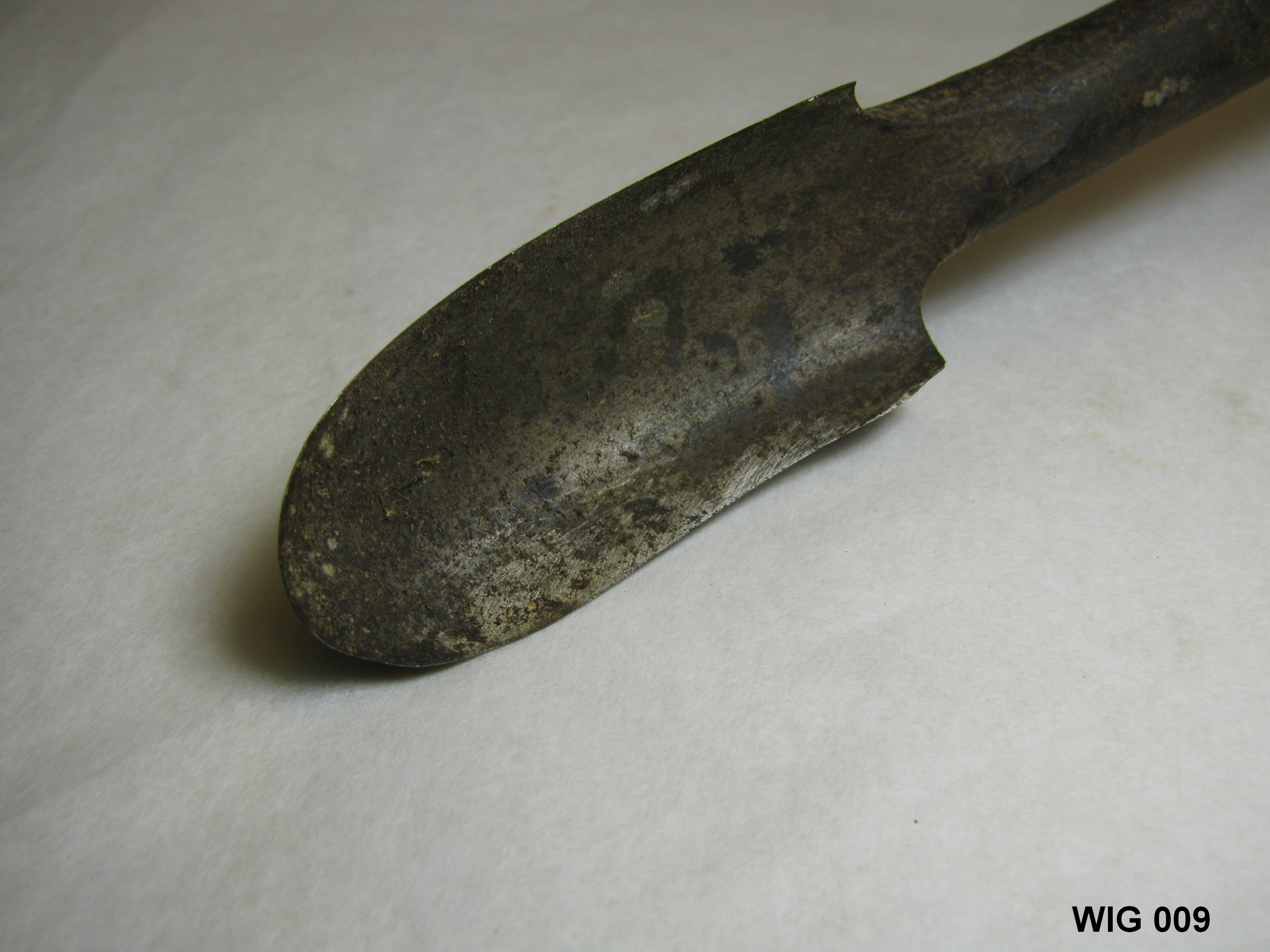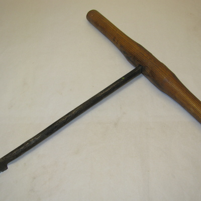 Ronde ijzeren stang met lepelboor en houten handvat. Stang is vastgezet met leertjes. Opschrift: EW 9. Blank, zwart.