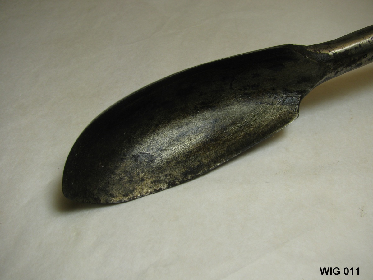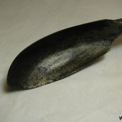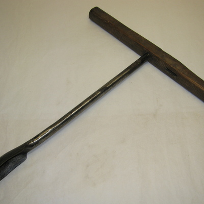 Ronde ijzeren steel met grote lepelboor en houten handvat met extra gat. Opschrift: EW 11. Zwart, bruin.
