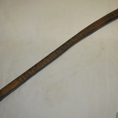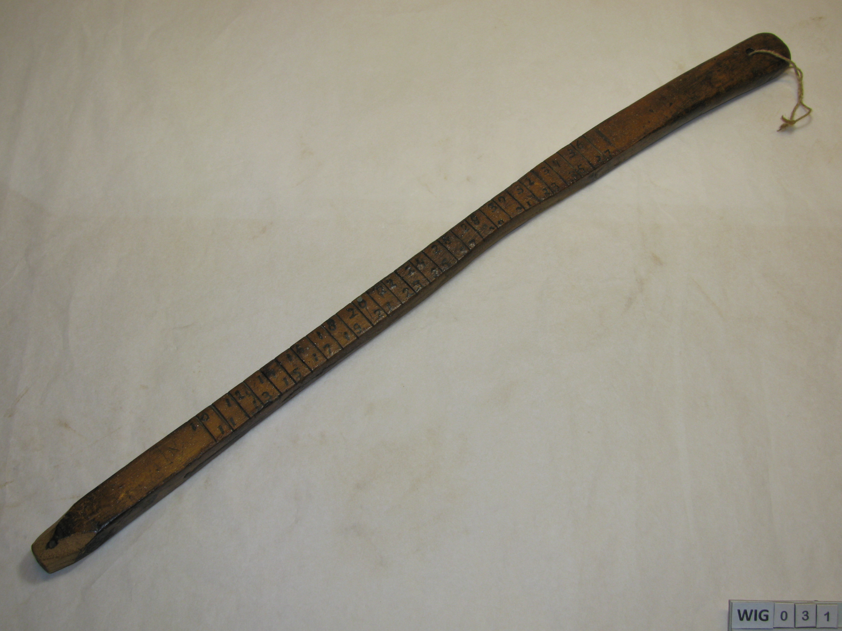 Houten maatlatje met gat en touwtje. Verdeling in cm van 10 t/m 37. Bruin.