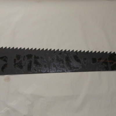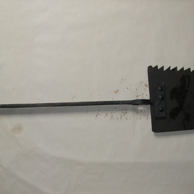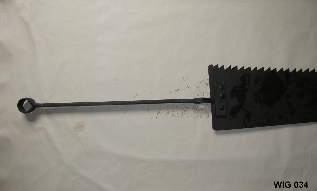 Grote ijzeren taps toelopende zaag met aan een kant een ronde huls met stukken ijzer vastgeklonken. Aan de brede kan een ijzeren rechthoekige stang, ook vastgeklonken, ook met huls. Zwart.