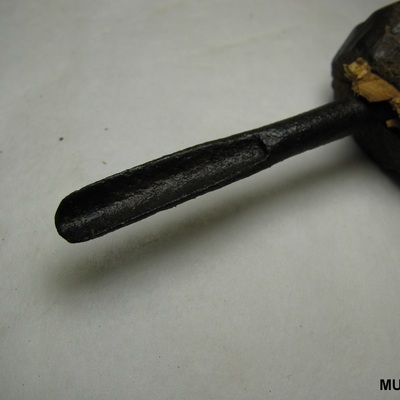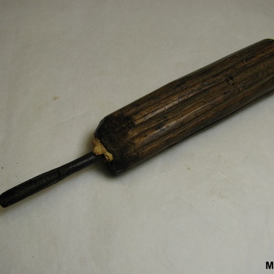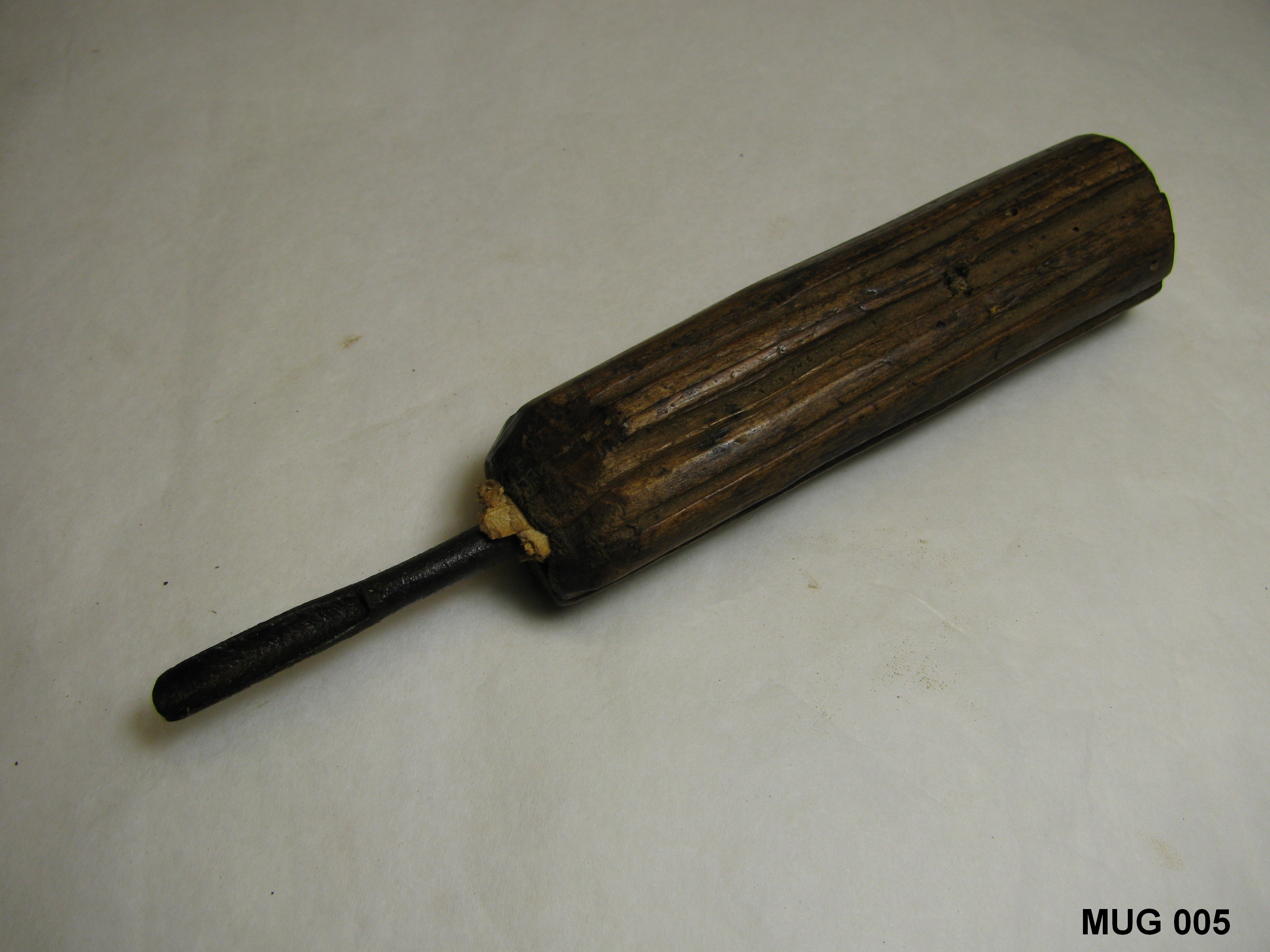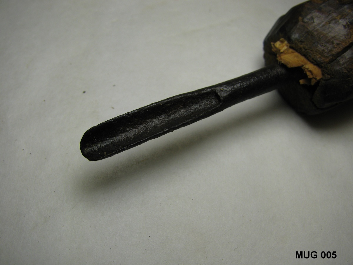 IJzeren mesje met scherp gebogen uiteinde, in houten handvat met gaatje. Zwart, bruin.