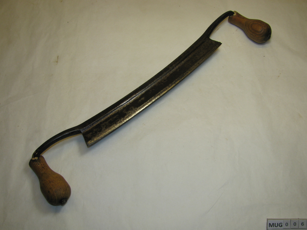 Breed, iets gebogen mes met aan weerszijden ronde houten handvaten. IJzer loopt door in de handvaten. Op ijzer "giramti" (merknaam?). Zwart, bruin.