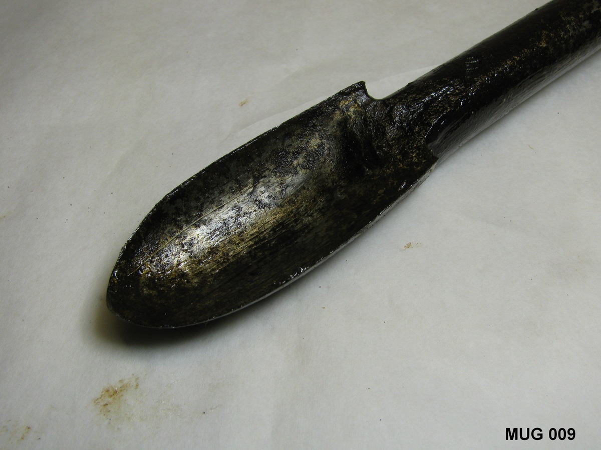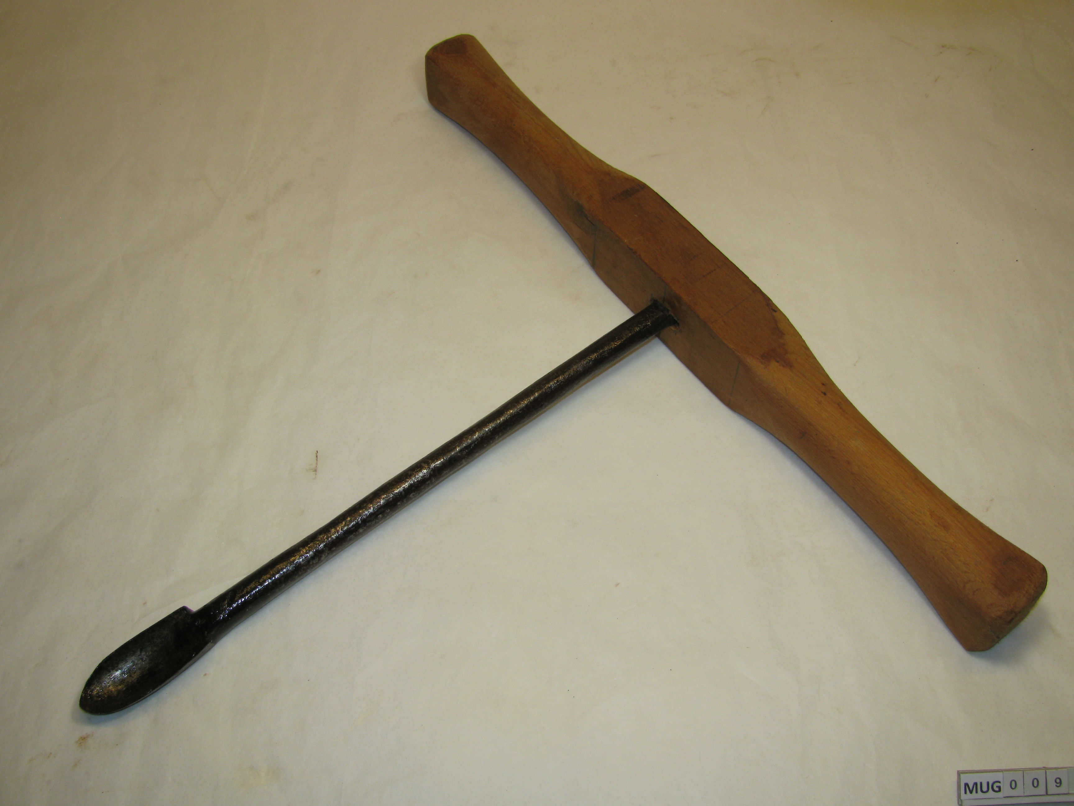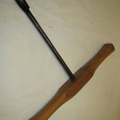 Ronde ijzeren stang met kleine lepelboor. Fors houten handvat met breed uitlopende uiteinden (vernieuwd). Bruin, zwart.