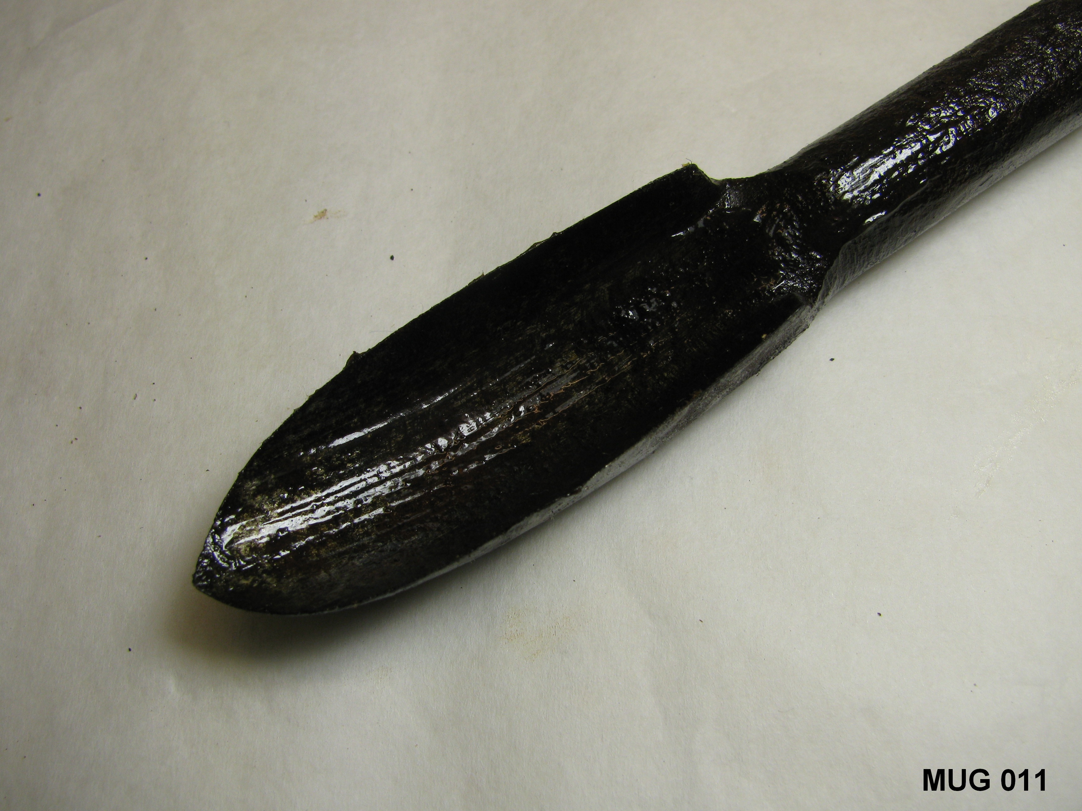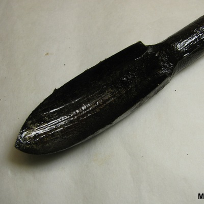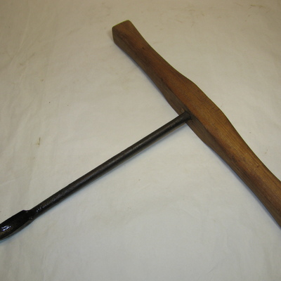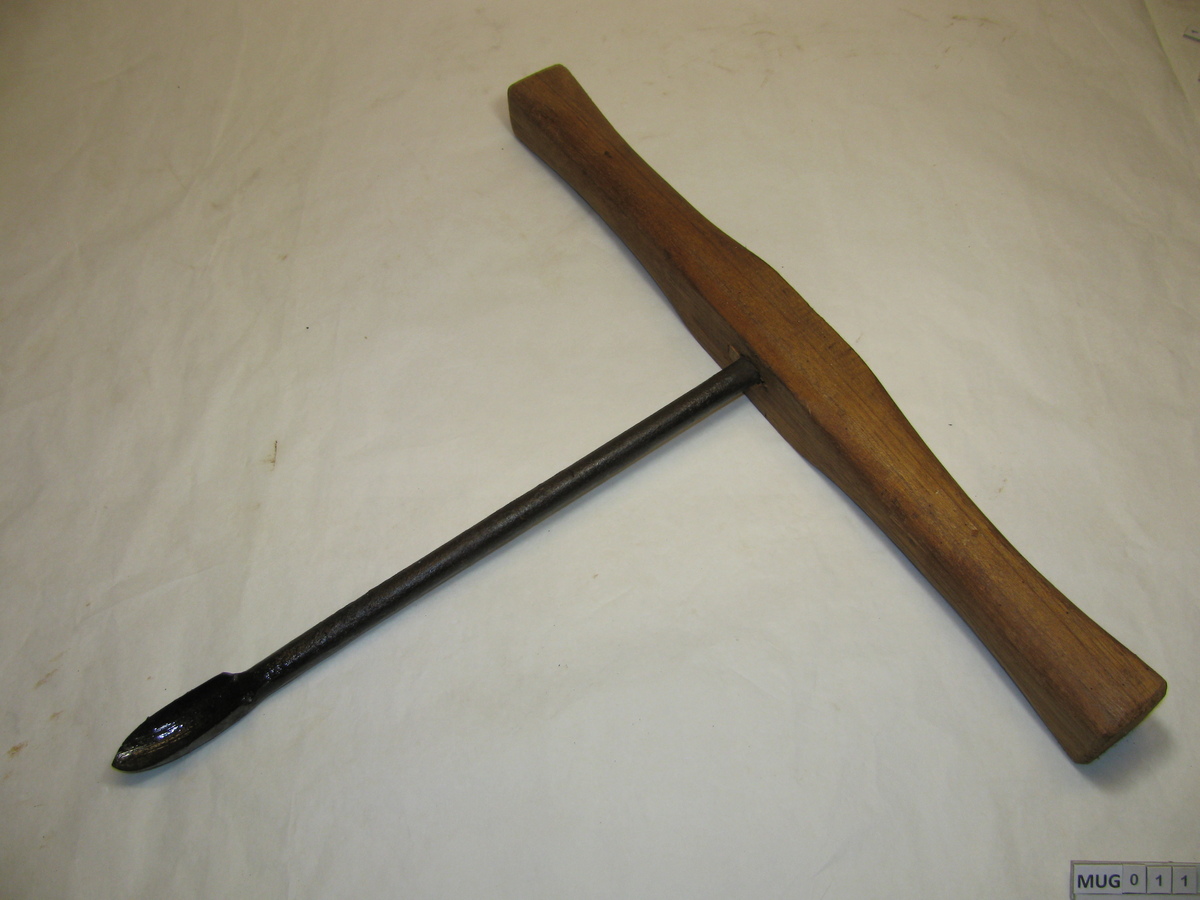 Ronde ijzeren stang met kleine spits toelopende lepelboor. Fors houten handvat met breed uitlopende uiteinden (vernieuwd). Bruin, zwart.