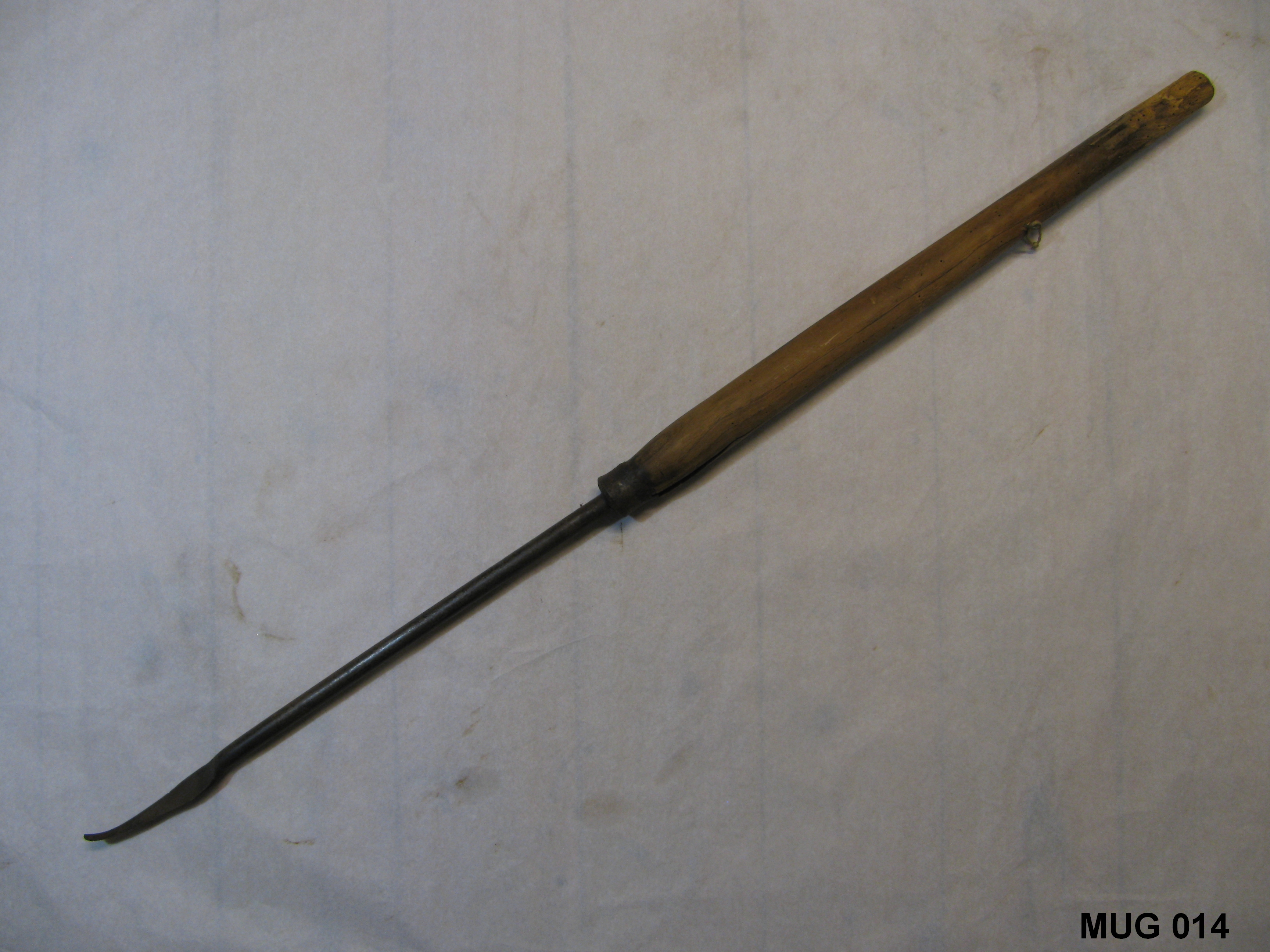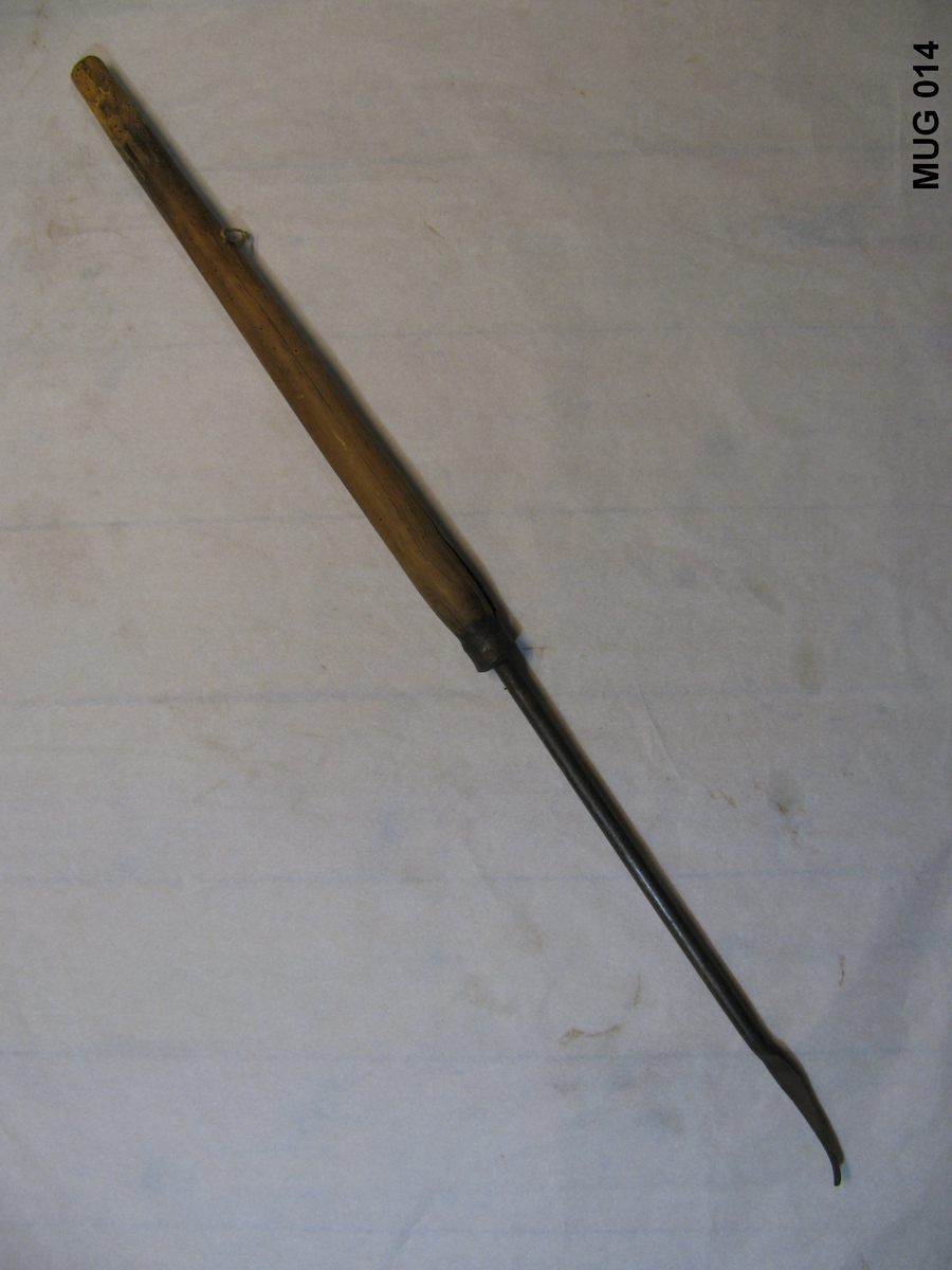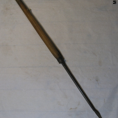 Ronde ijzeren stang met spits toelopende mes met opgaand puntje, plat van boven, van onderen rond. Houten handvat met ijzeren ring. Zwart, bruin.