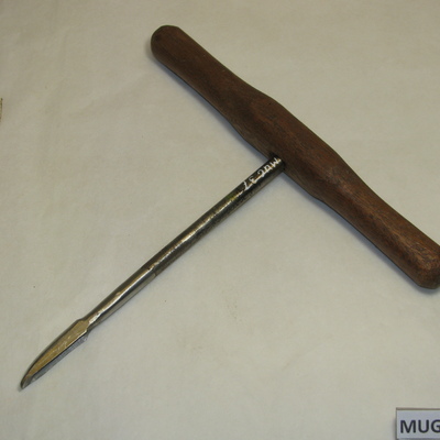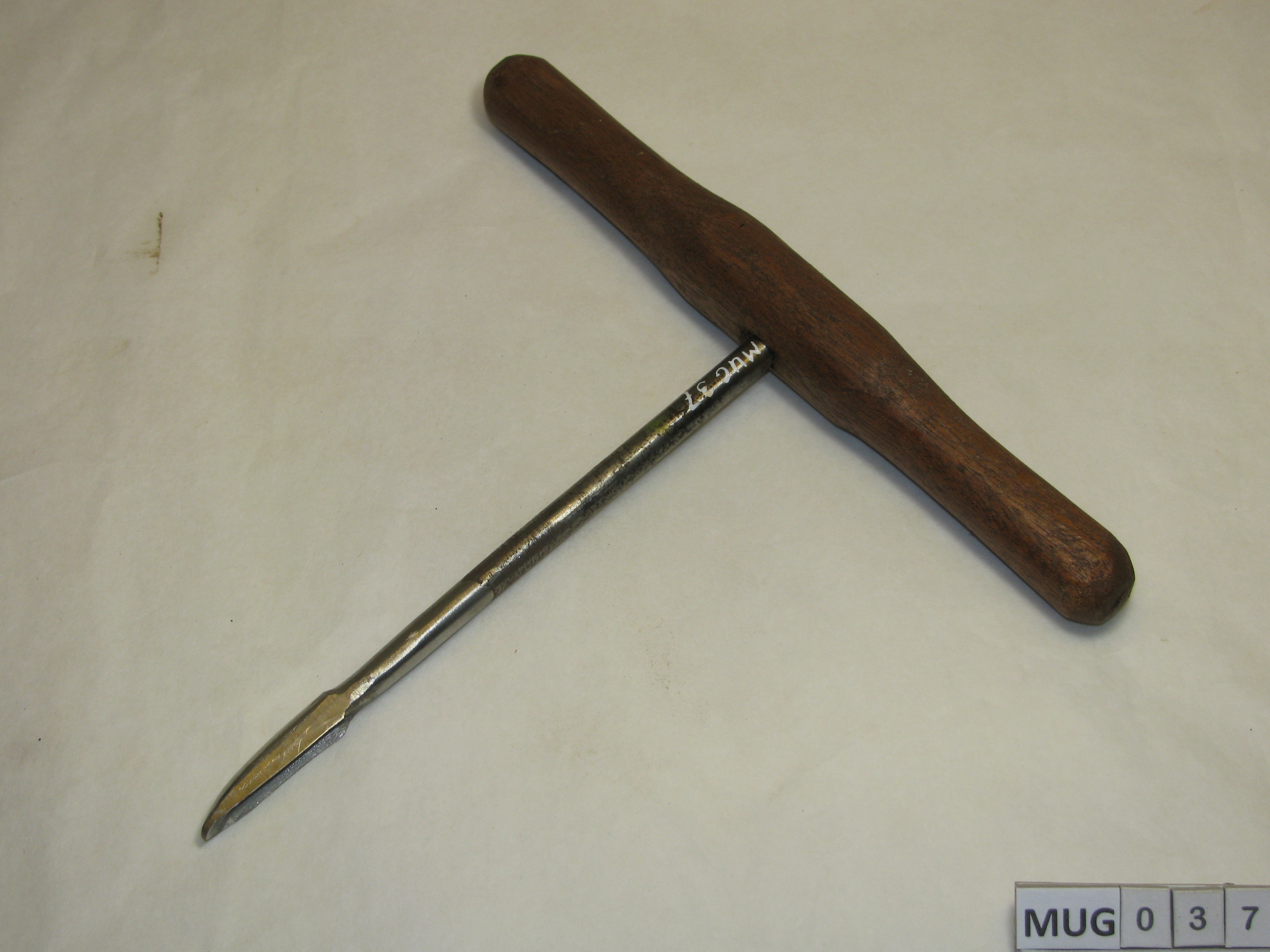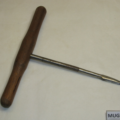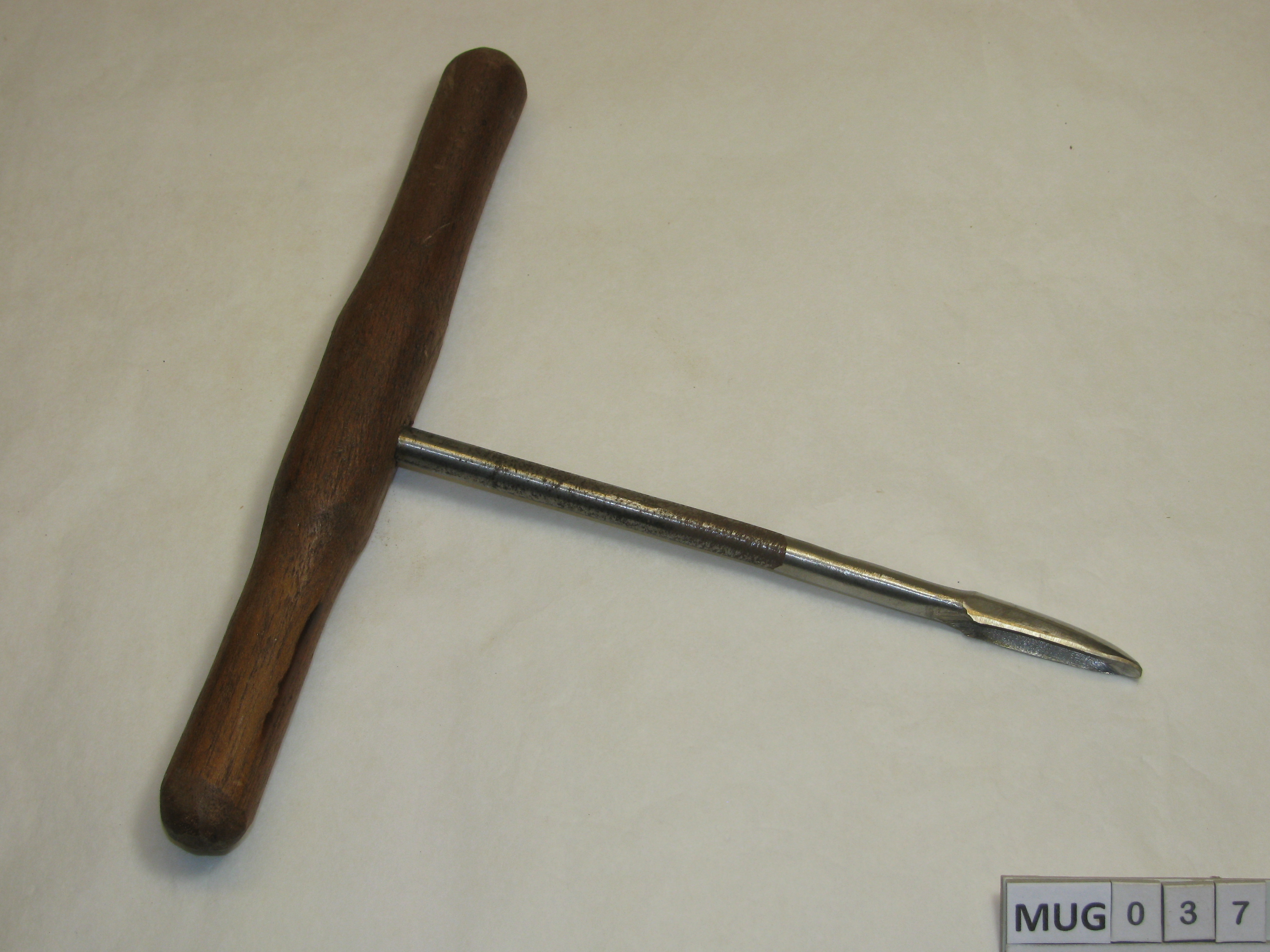 Ronde ijzeren stang met kleine langwerpige lepelboor (dop) en vrij groot houten handvat. Zwart, bruin.