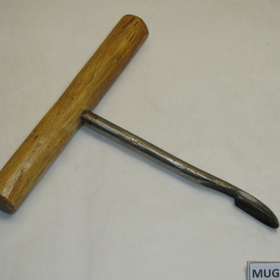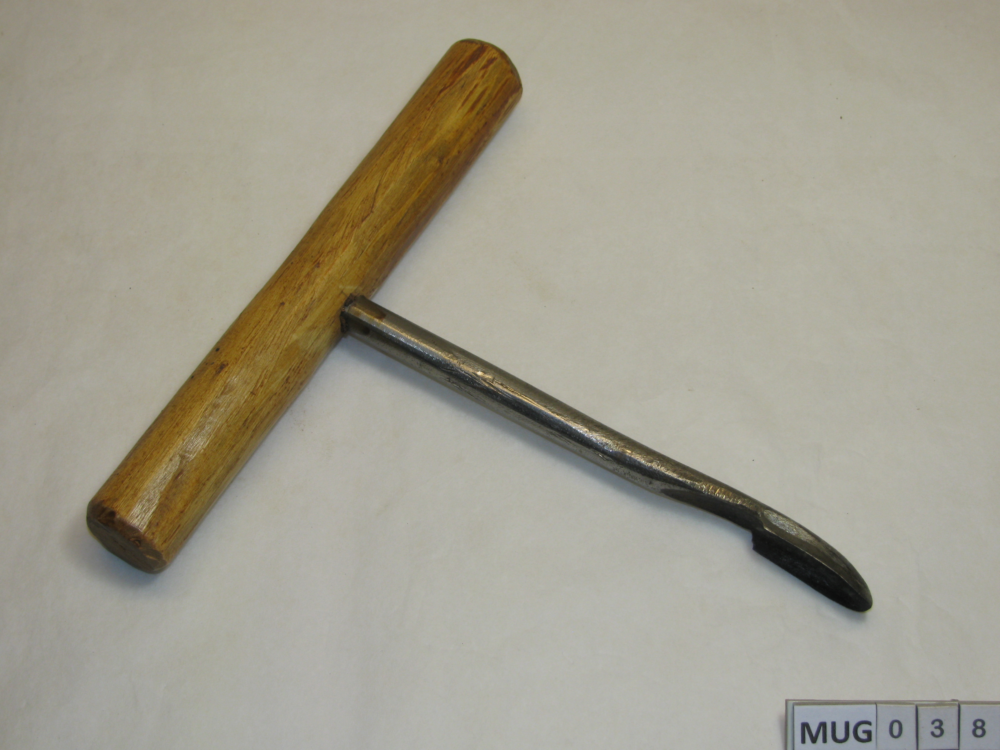 Ronde ijzeren stang met brede lepelboor (dop) en rond houten handvat. Blank, bruin.