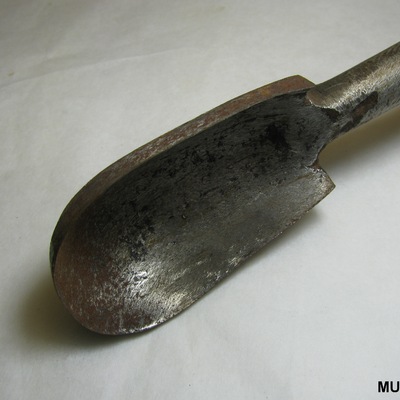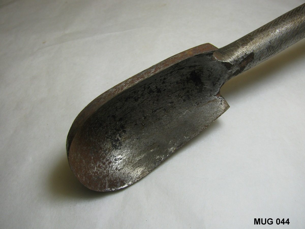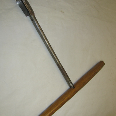 Ronde ijzeren stang met grote lepelboor en houten handvat. Bruin, blank.
