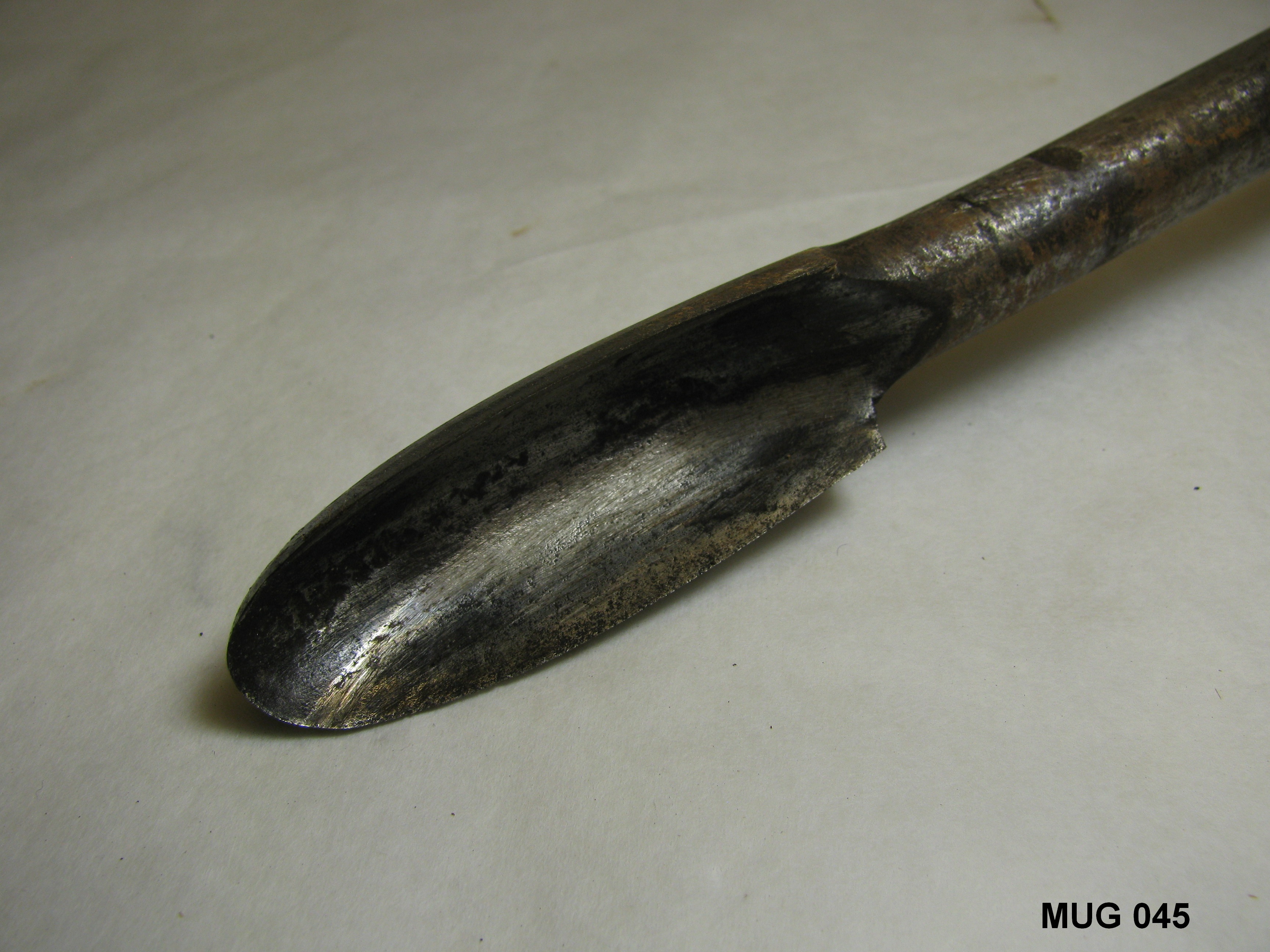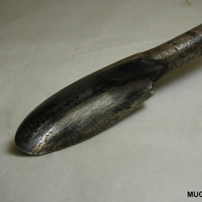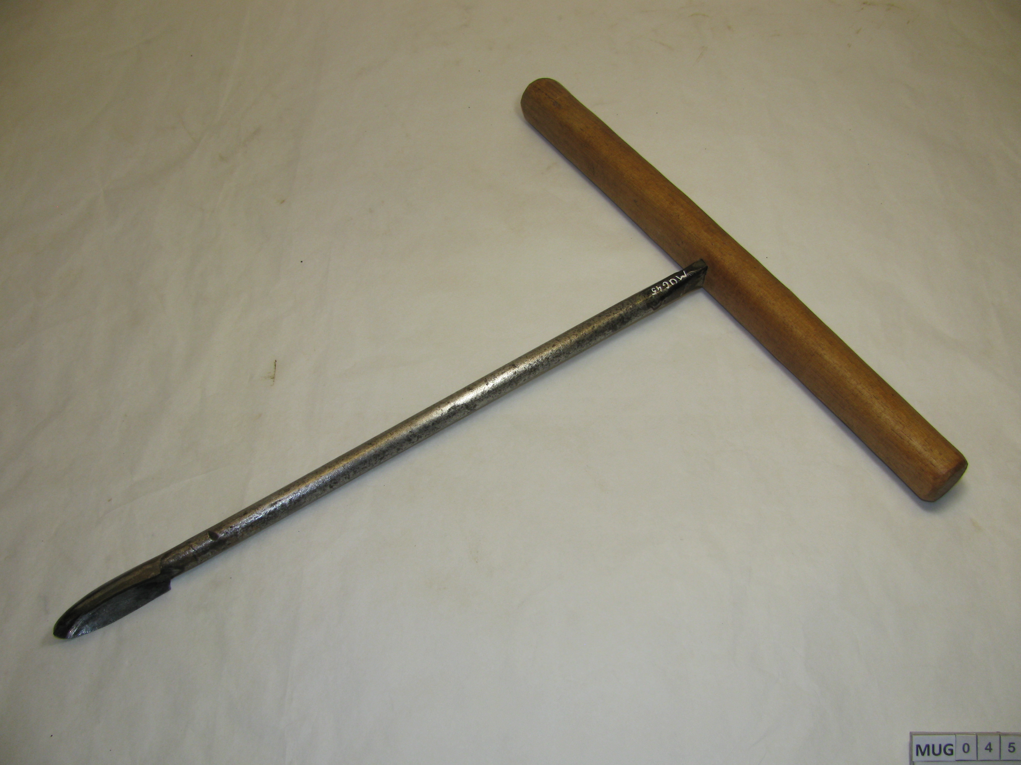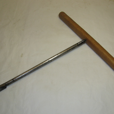 Ronde ijzeren stang met kleine langwerpige lepelboor en rond houten handvat. Zwart, bruin.