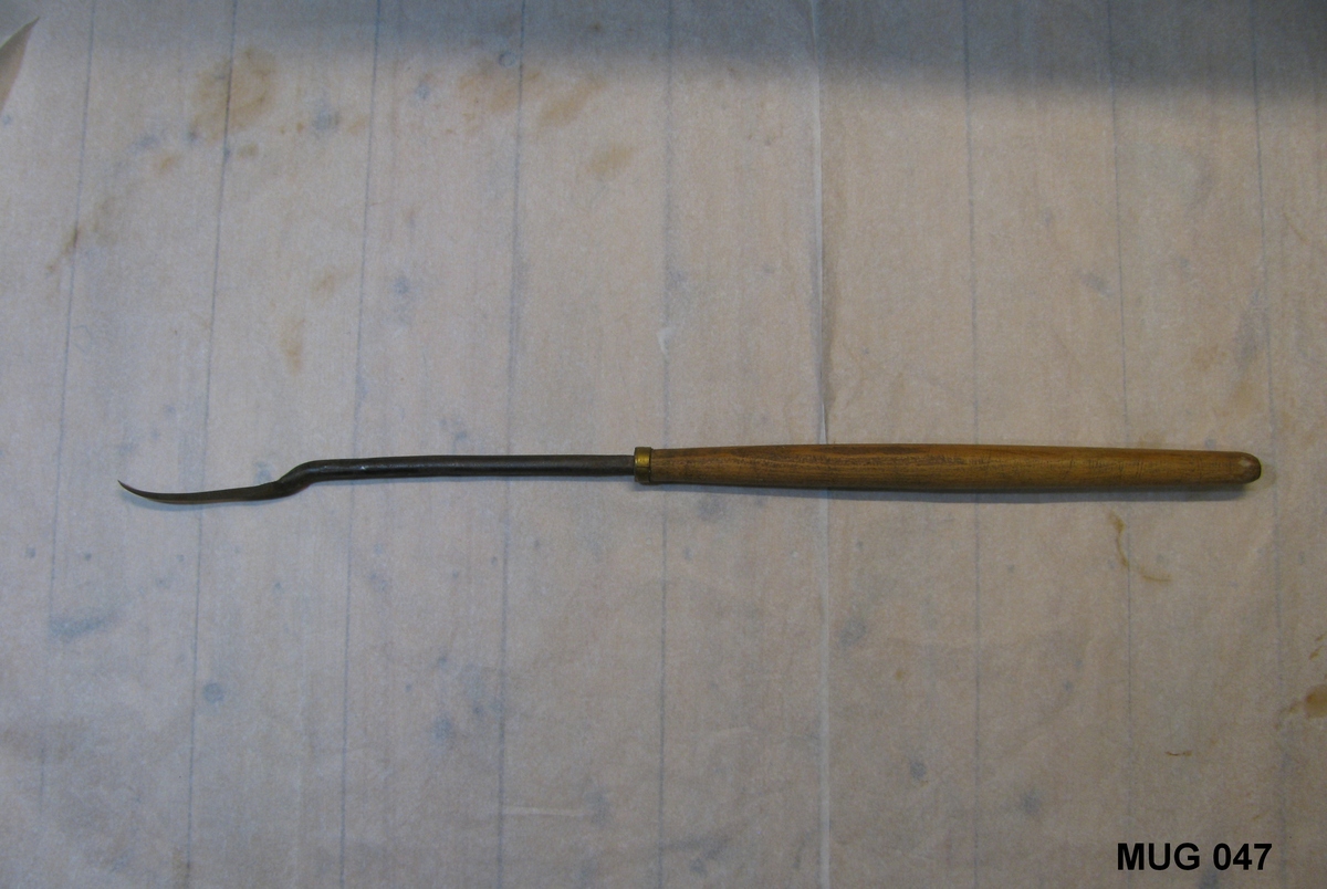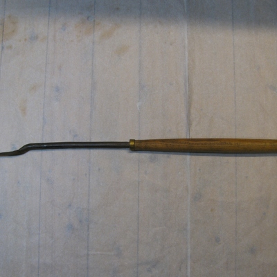 Ronde ijzeren stang met dubbelzijdig snijdend mes met spits uiteinde en iets gebogen. Mes is plat van boven, driehoekig van onderen. Met lange houten steel met koperen ringetje. Zwart, bruin.