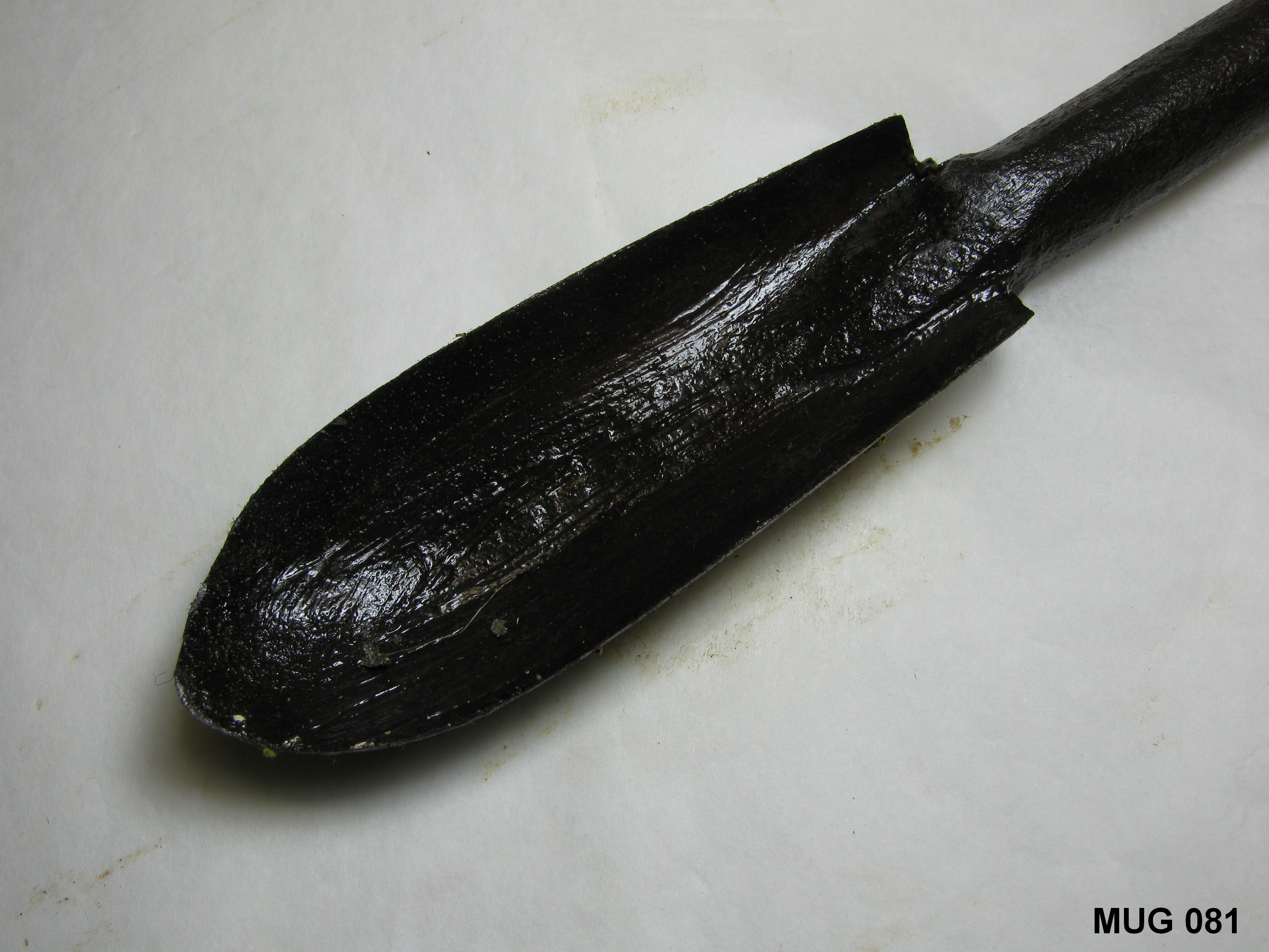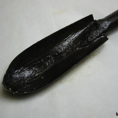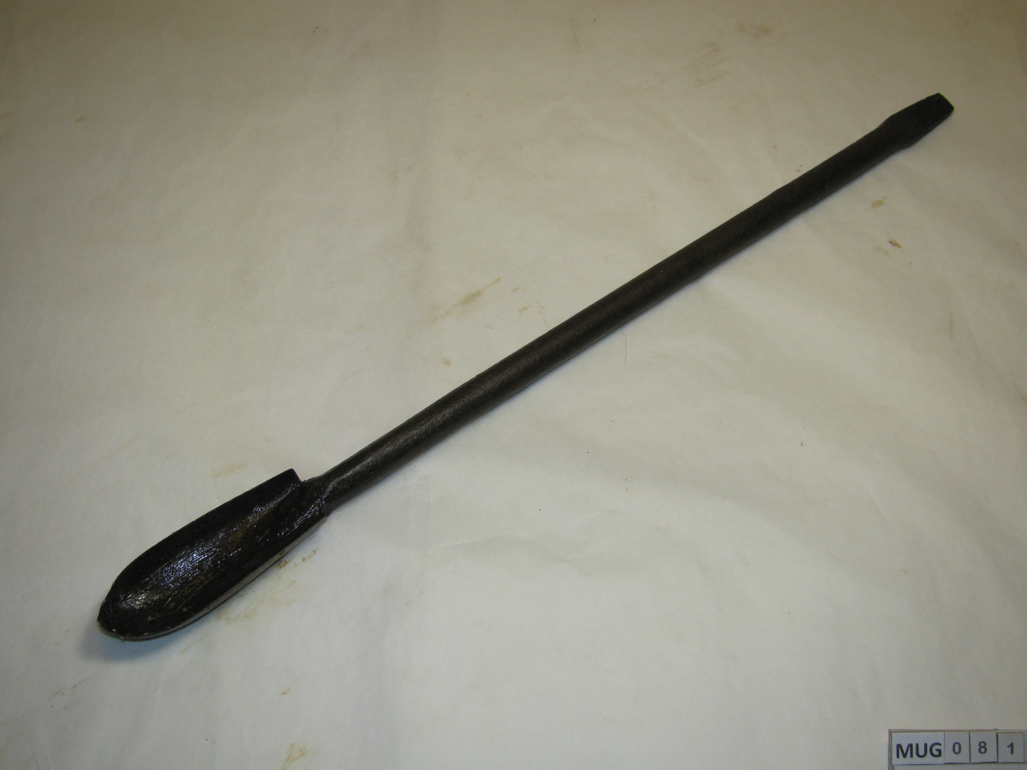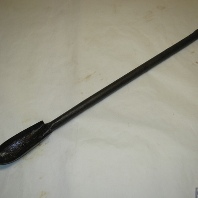 Ronde ijzeren stang met langwerpige lepelboor, andere uiteinde is plat. Zwart.