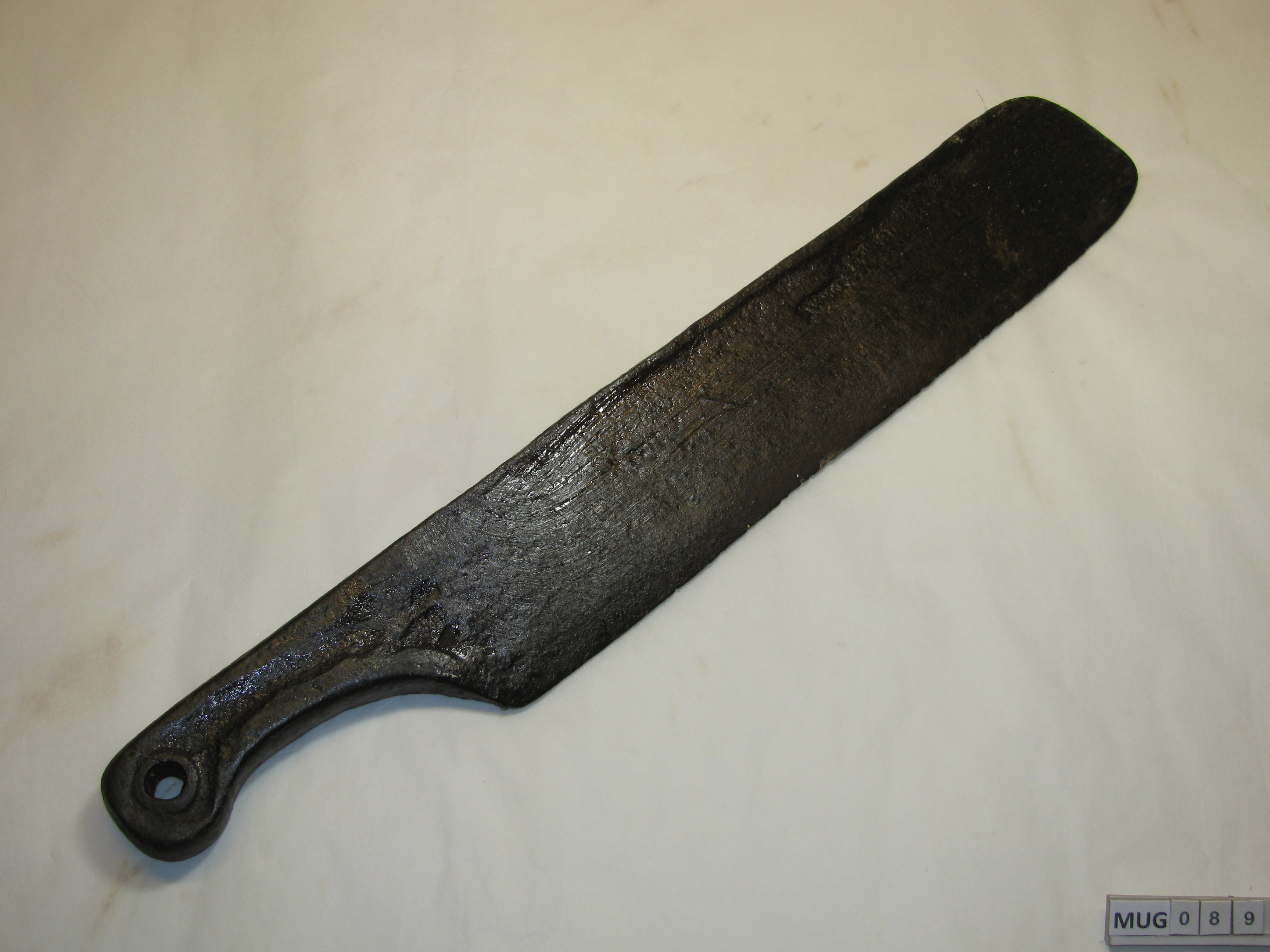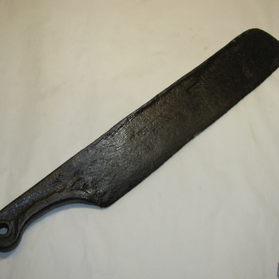 Breed ijzeren mes, scherp aan de onderzijde, breed aan de bovenzijde. Mes is 1 geheel met kort ijzeren handvat met gat. Zwart.