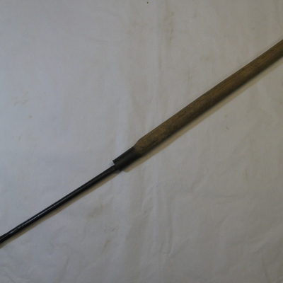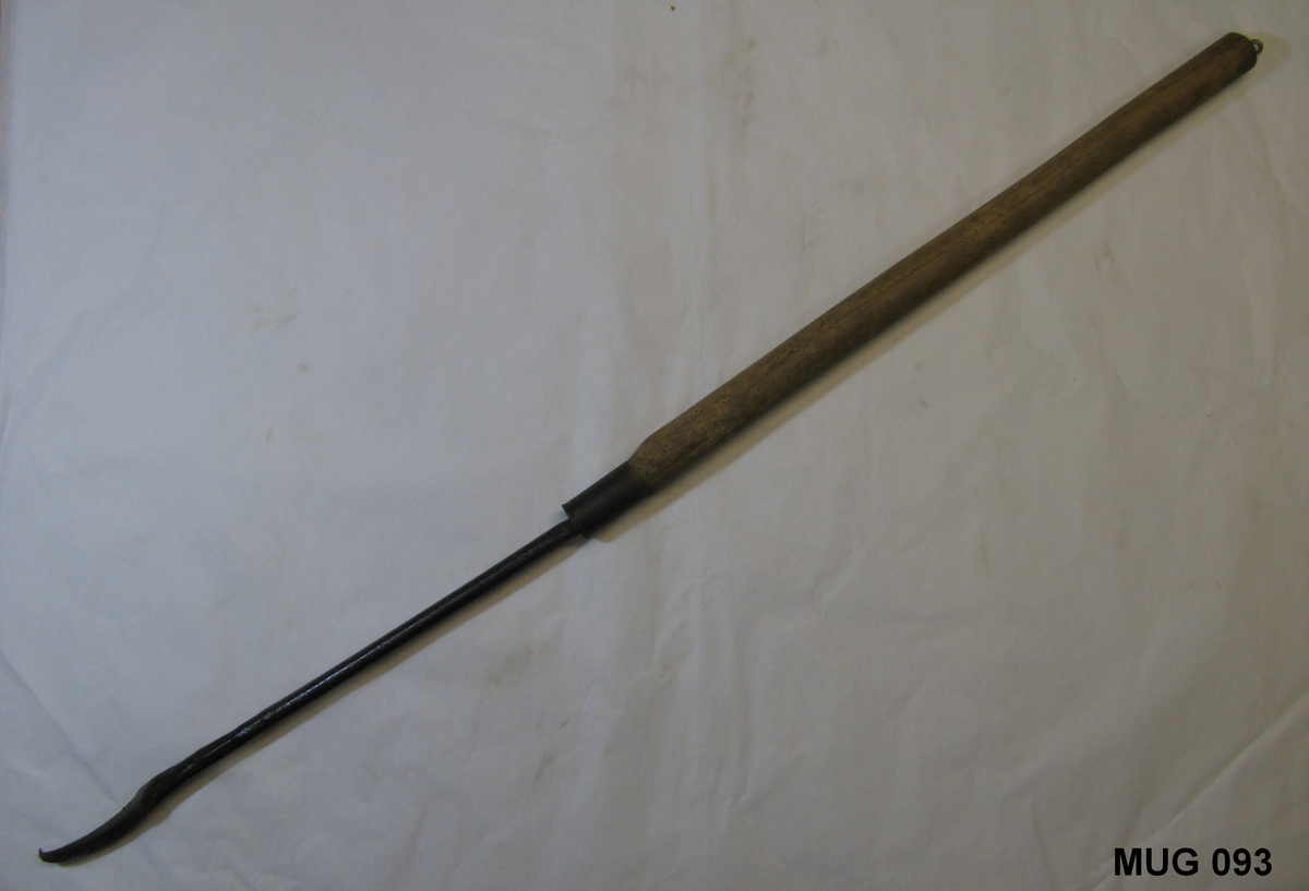 Ronde, gesmeedde ijzeren steel met tweezijdig snijdend mes, eindigend in krul (puntig toelopend). Met lange houten steel met opvallend brede ring en ringetje om op te hangen. Zwart, bruin.