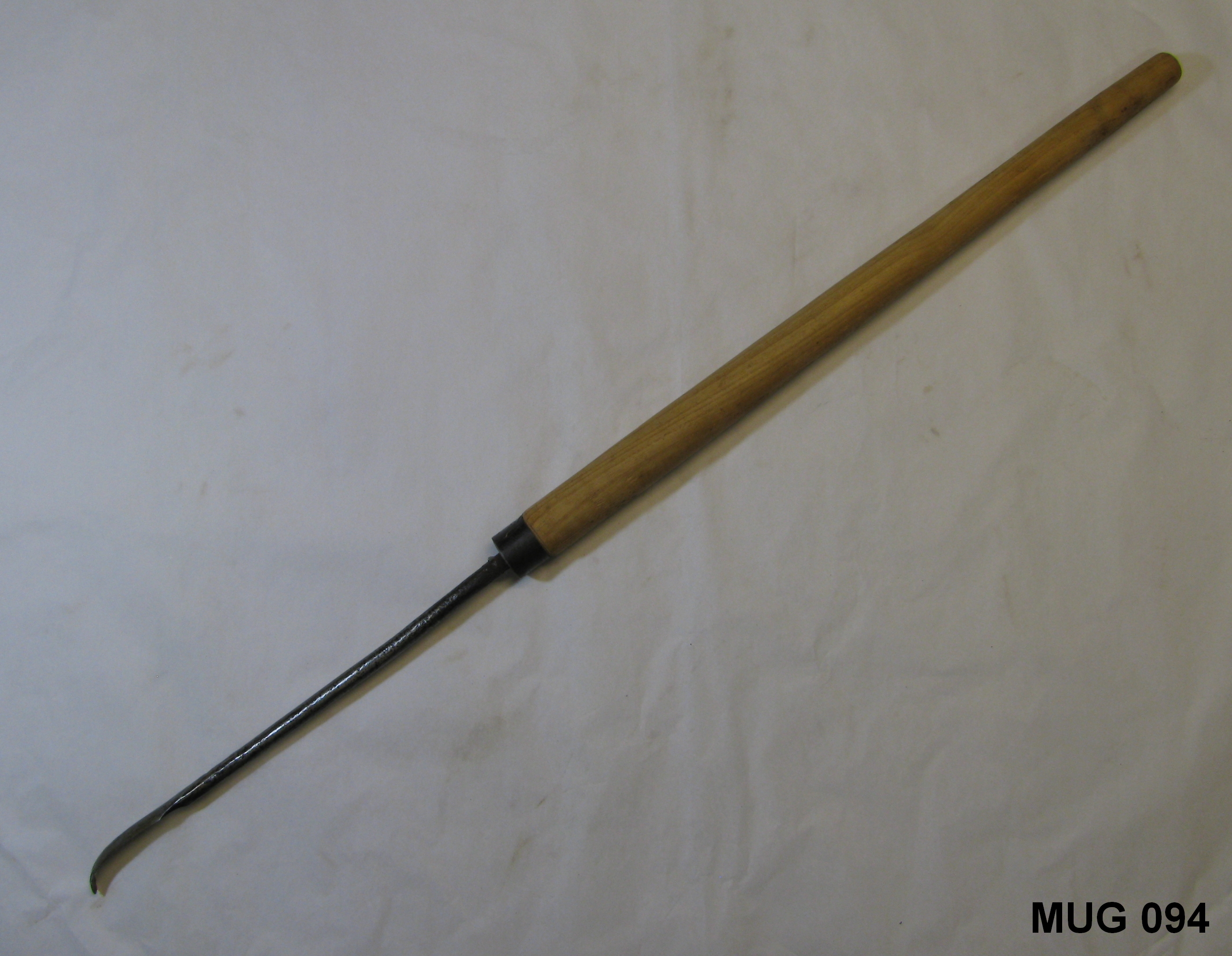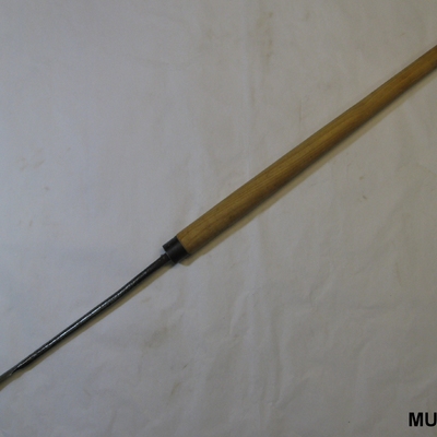 Ronde ijzeren steel met rechthoekig tweezijdig snijdend mes, het eind is rond en iets gekruld. Met nieuwe houten steel met ring, taps toelopend. Zwart, bruin.