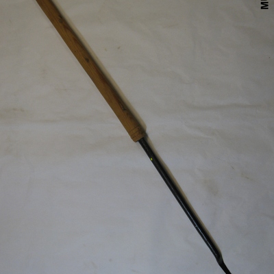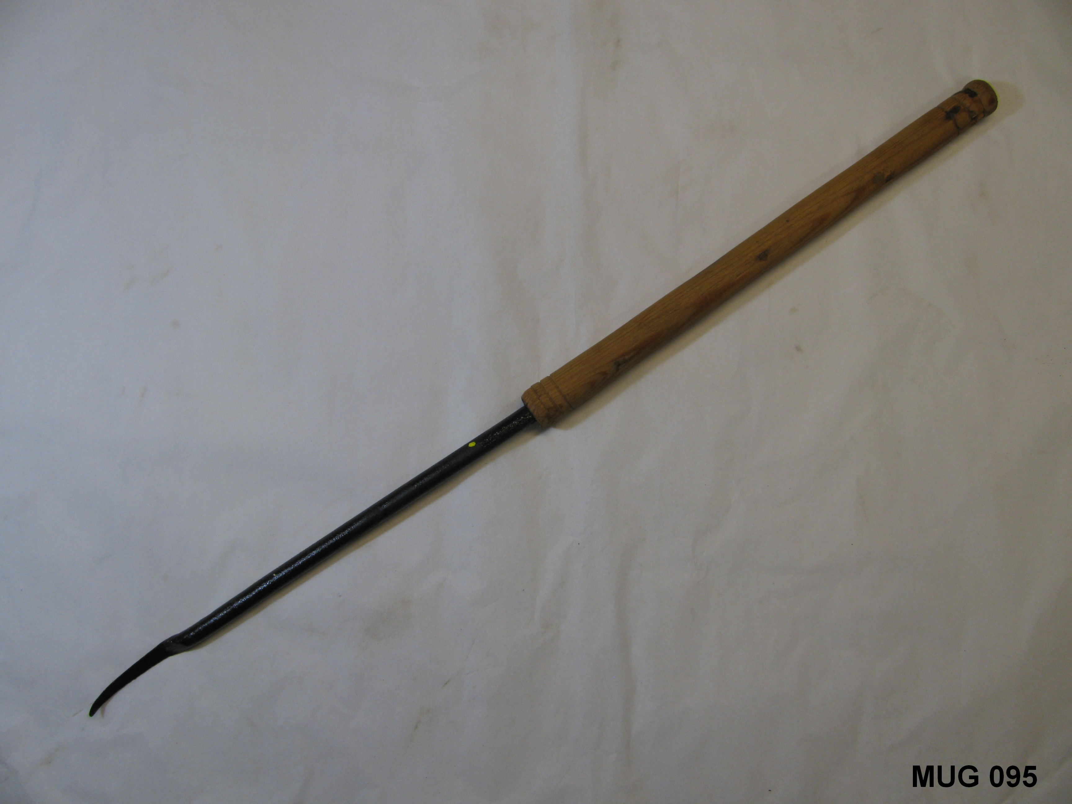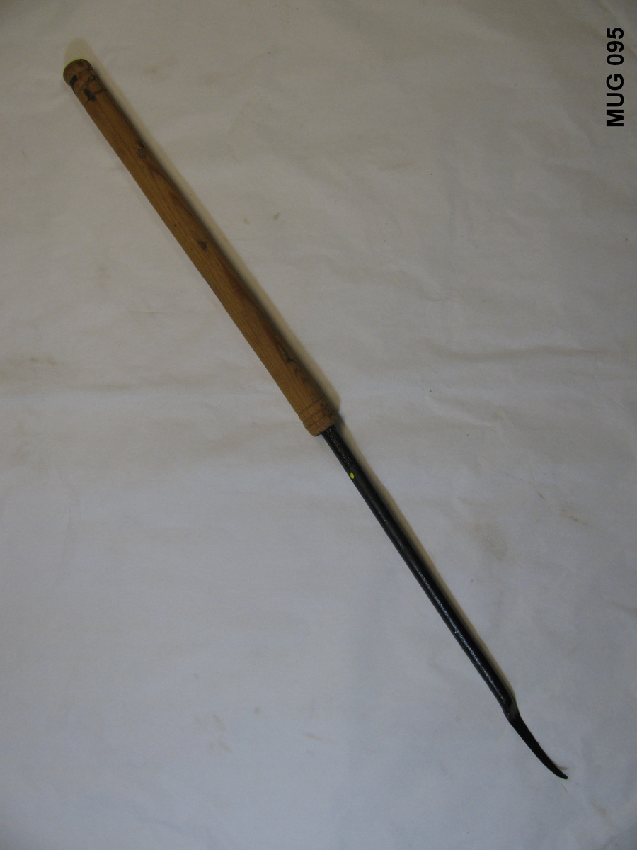 Ronde ijzeren steel met langwerpig tweezijdig snijdend mes, eindigend in een gebogen puntje. Met houten handvat met gat. Zwart, bruin.