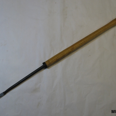 Ronde ijzeren steel met plat, rechthoekig, tweezijdig snijdend mes, met rond gebogen uiteinde. Met vernieuwde houten steel met ring. Zwart, bruin.