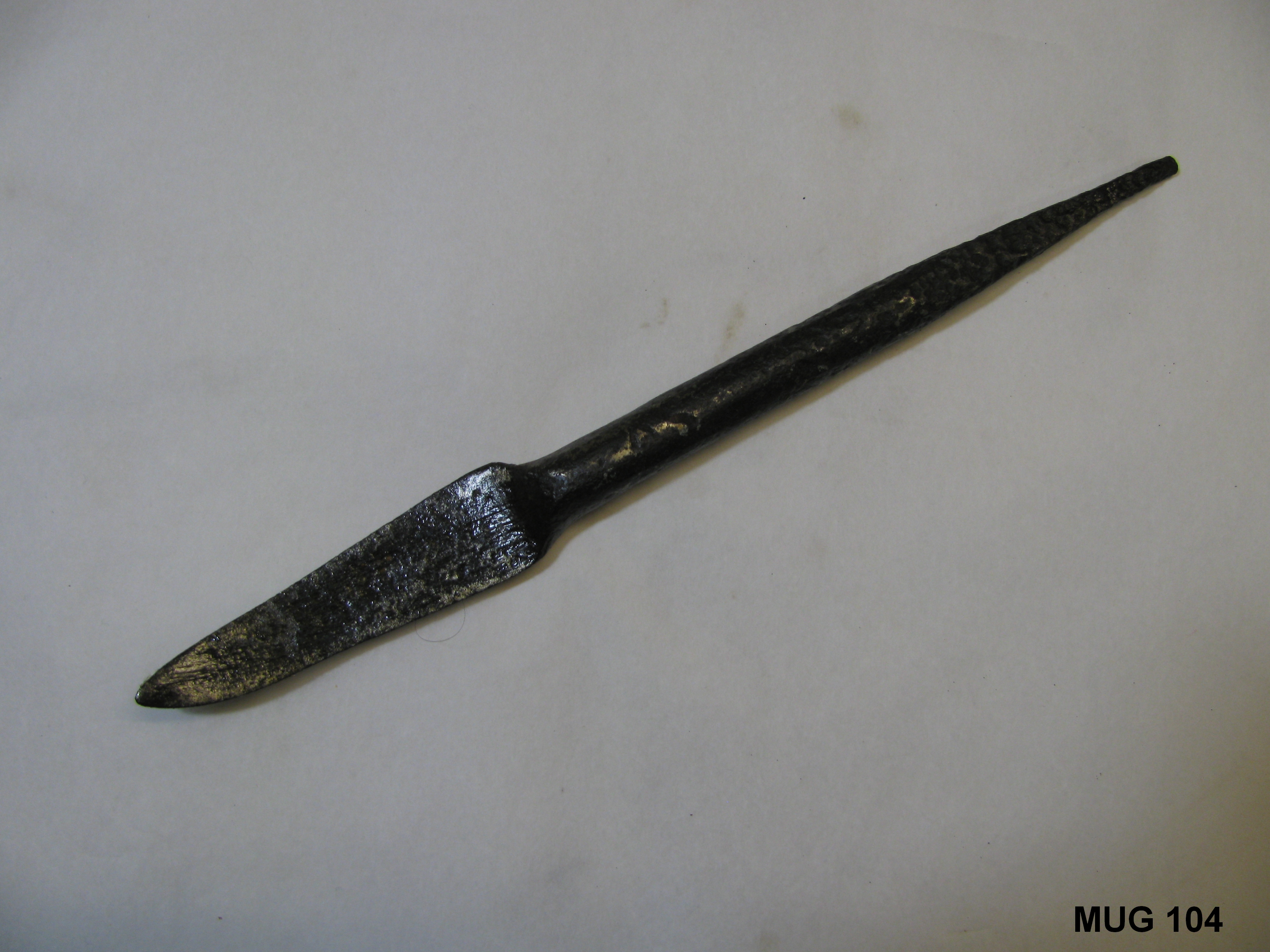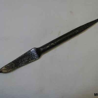 Korte ijzeren ronde stang, met plat, iets gebogen tweezijdig snijdend mes, puntig uiteinde. Stang eindigd vierkant en puntig. Op steel: AS. Zwart.