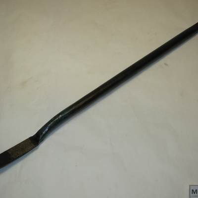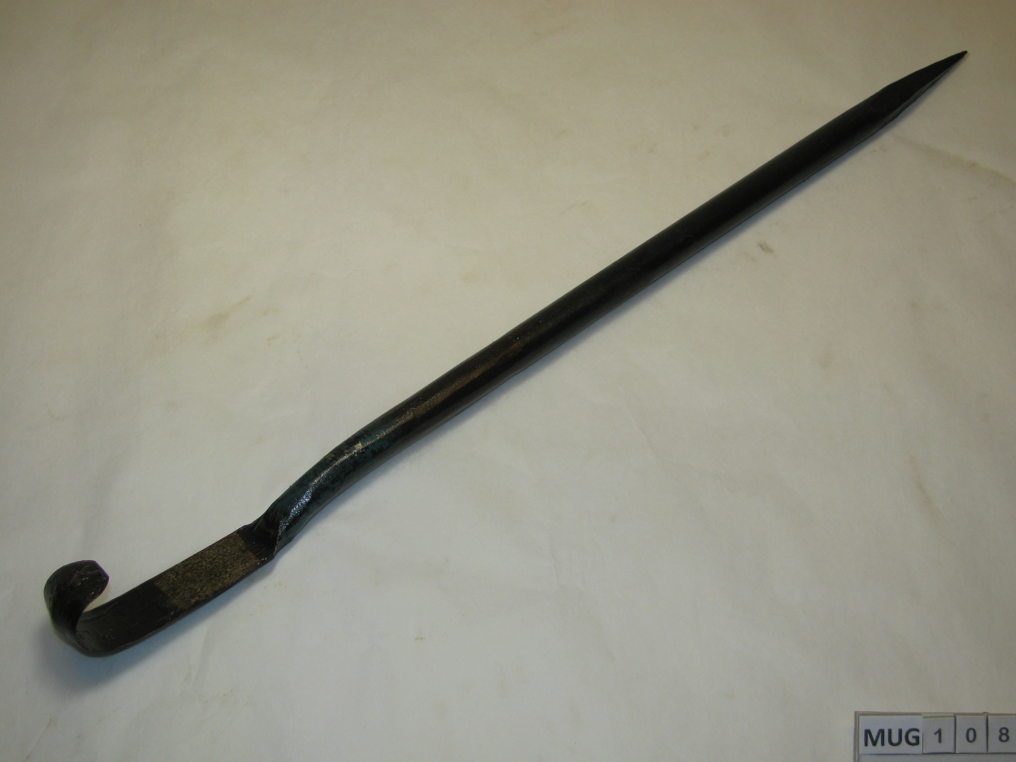 Ronde ijzeren stang met sterk gekruld rechthoekig mes. Steel eindigt vierkant en puntig. Zwart.