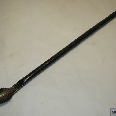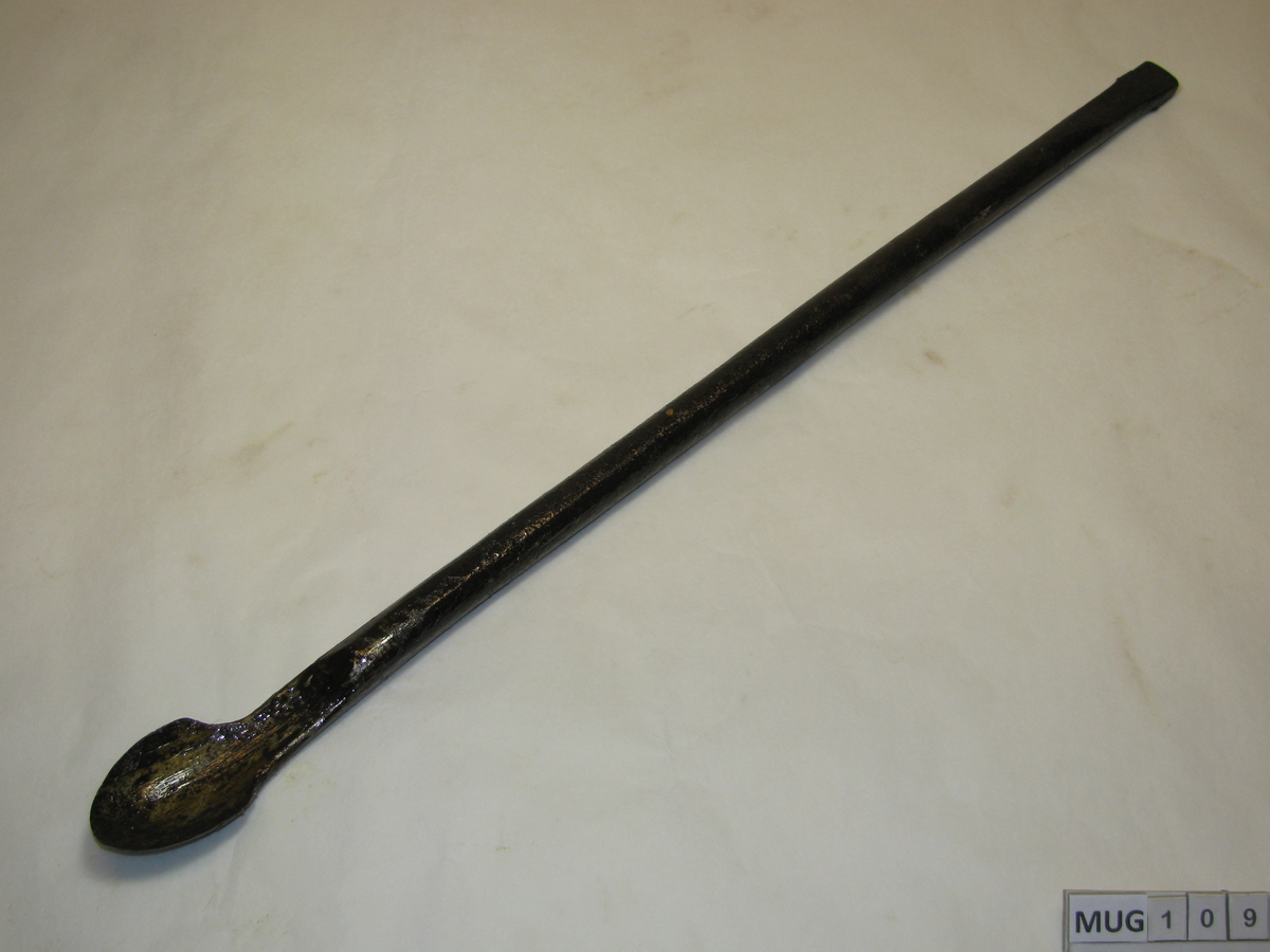 Dikke, ronde ijzeren stang met lepelvormige platte boor. Stang heeft plat uiteinde. Zwart.