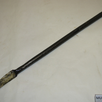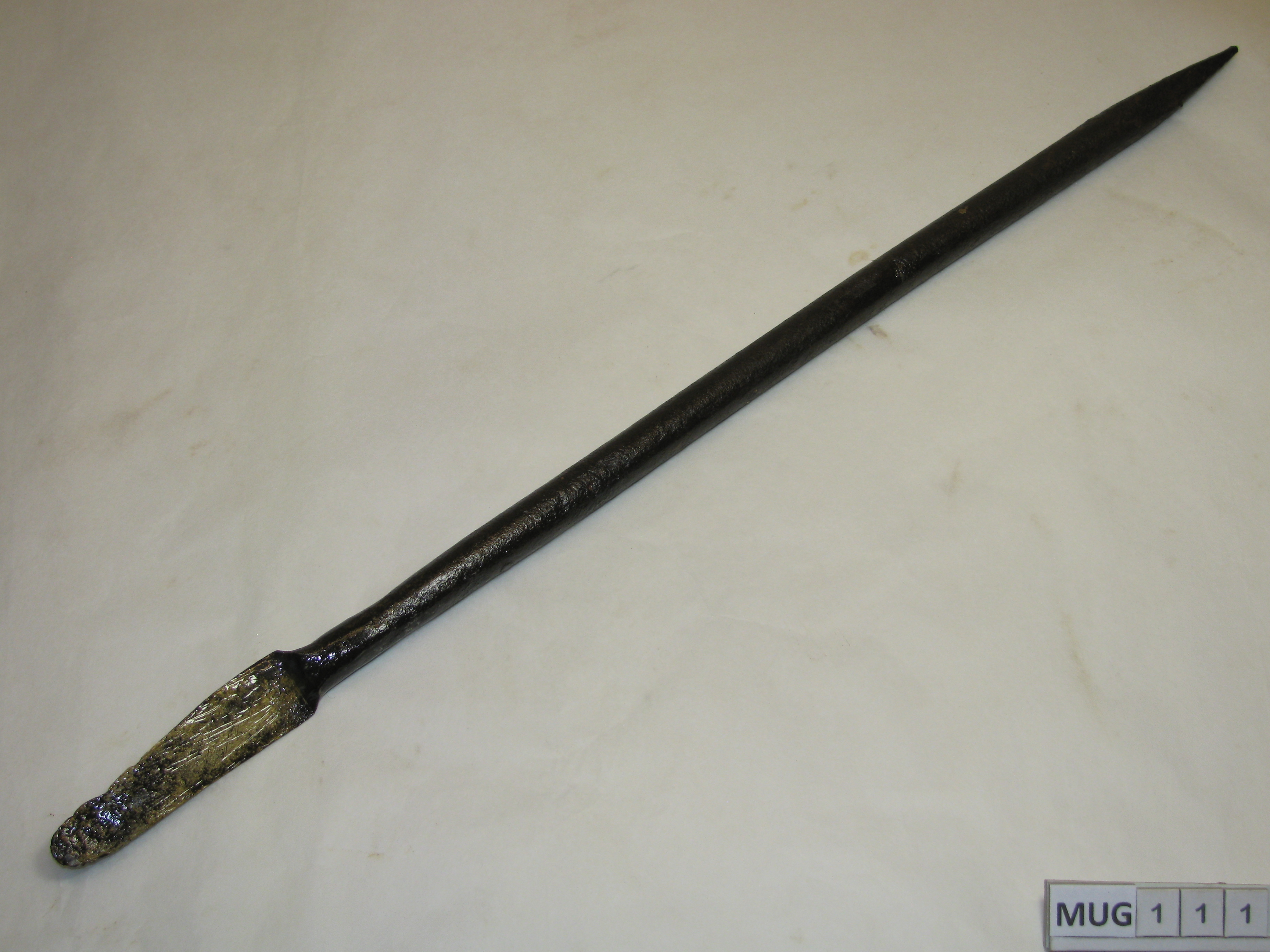 Ronde ijzeren stang met plat mes. Steel eindigt vierkant en spits. Zwart.