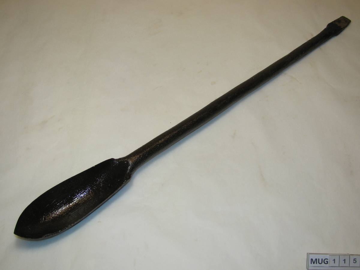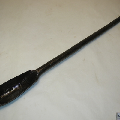 Forse, ronde ijzeren stang met grote, langwerpige boor, eindigend in een punt. Stang heeft plat uiteinde. Zwart.