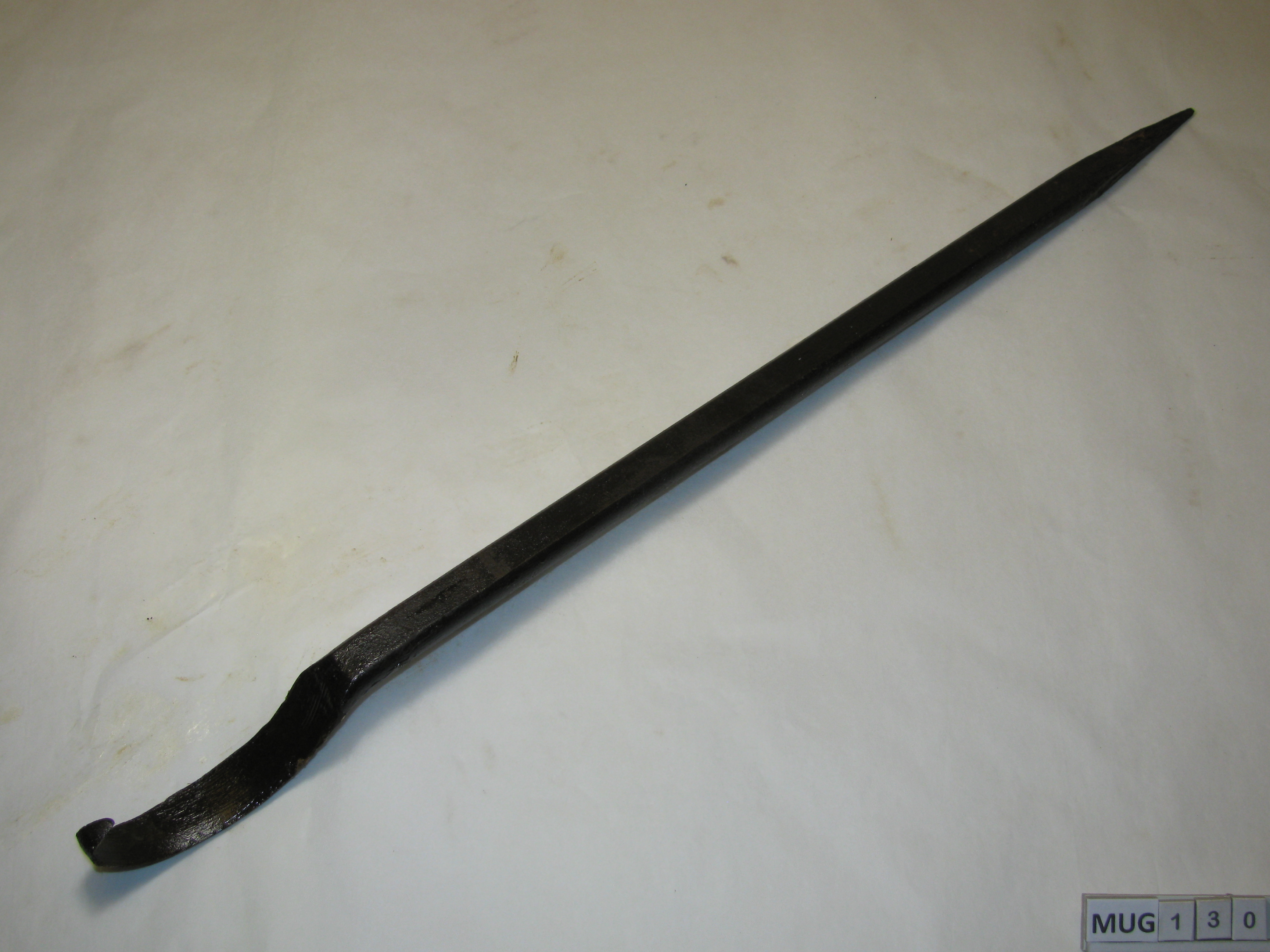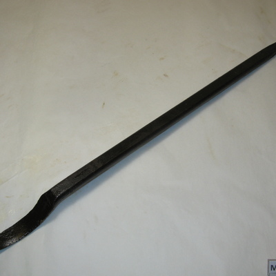 Platte rechthoekige stang met btweezijdig snijdend mes; puntje is sterk gebogen. Andere uiteinde loopt spits toe. Zwart.