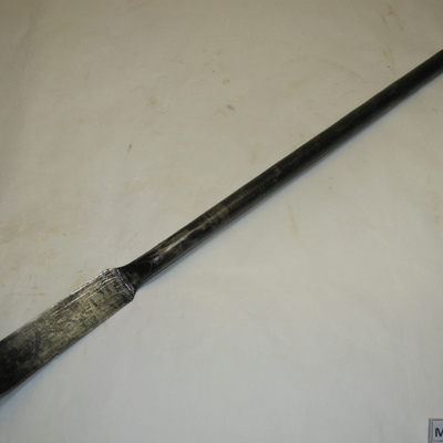 Ronde ijzeren stang met rechthoekig, tweezijdig snijdend mes; ronde uiteinde is iets gebogen. Andere uiteinde is vierkant en loopt spits toe. Zwart.