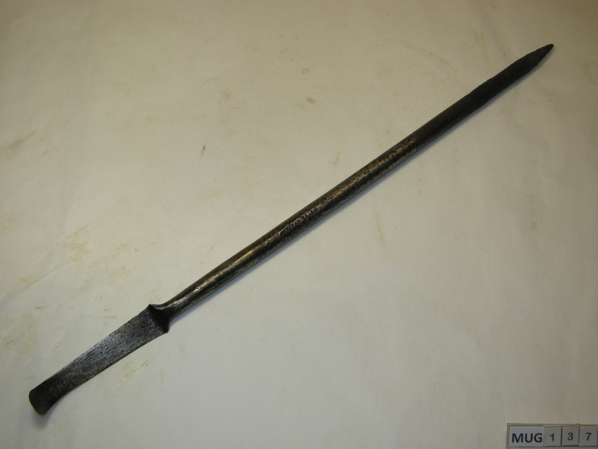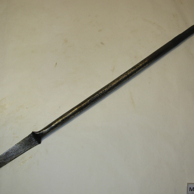 Ronde ijzeren stang met langwerpig, tweezijdig snijdend mes met gebogen rond uiteinde. Andere uiteinde is vierkant en spits. Zwart.