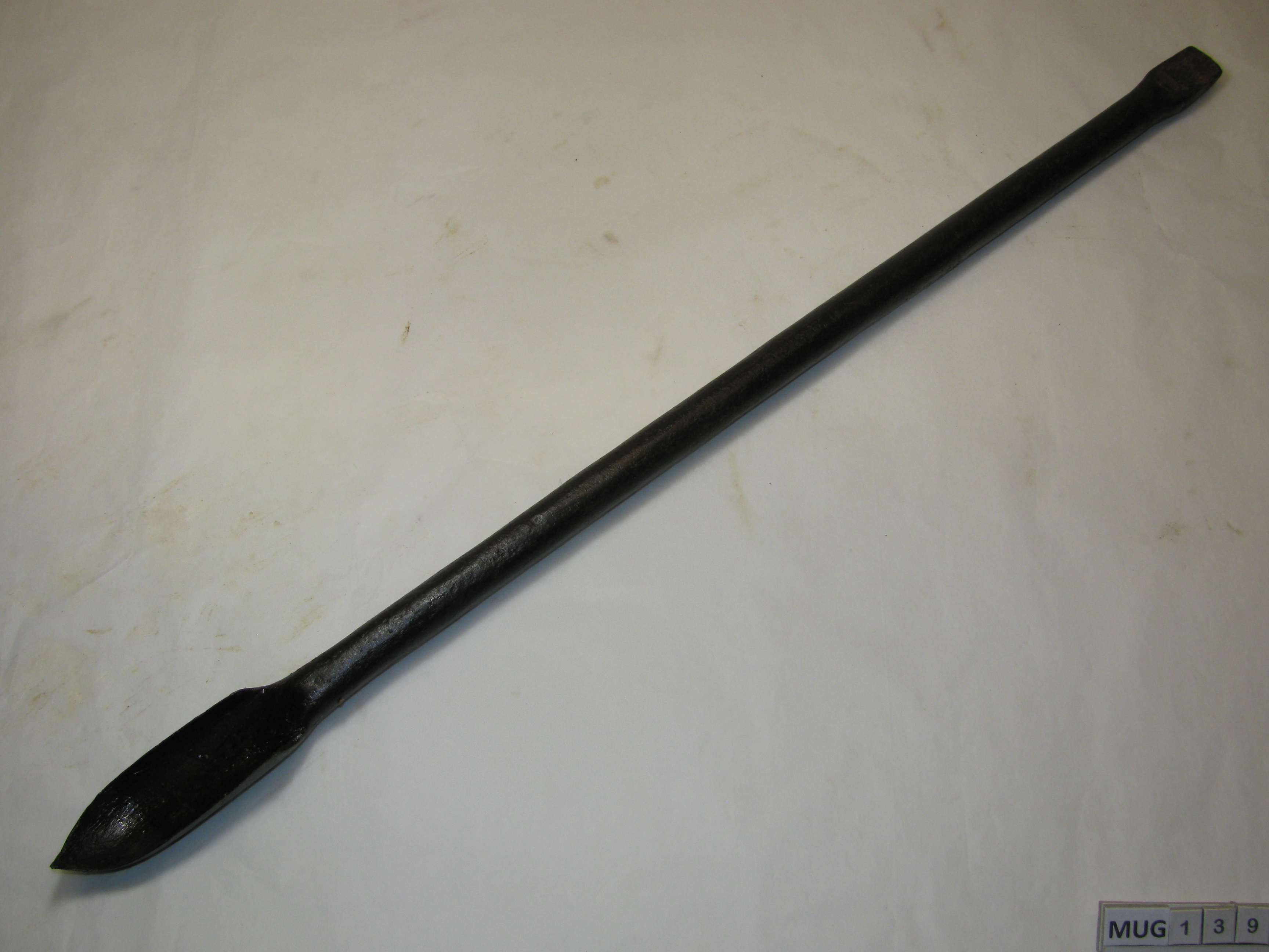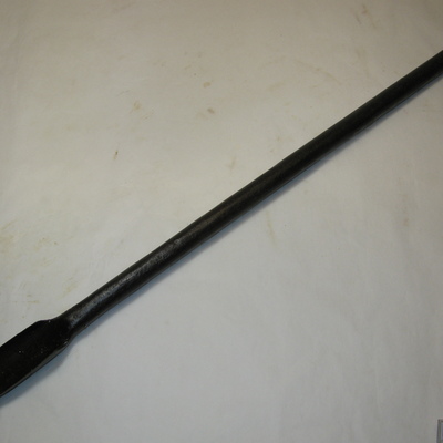 Ronde ijzeren stang met langgerekte, puntige boor, andere uiteinde is breder en plat. Zwart.