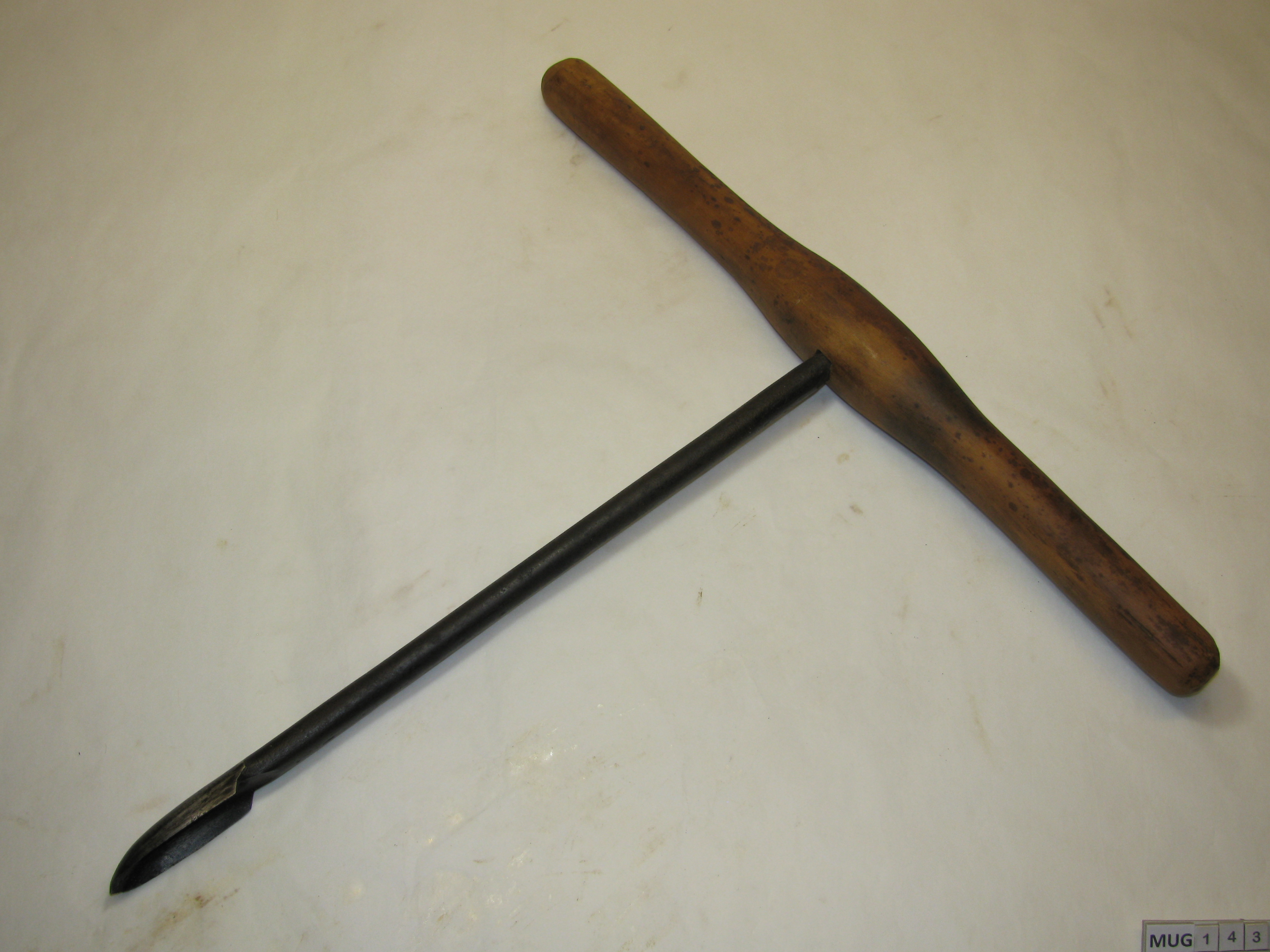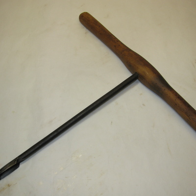 Ronde ijzeren stang met smalle, langgerekte boor (voorloper) en houten handvat. Zwart, bruin.