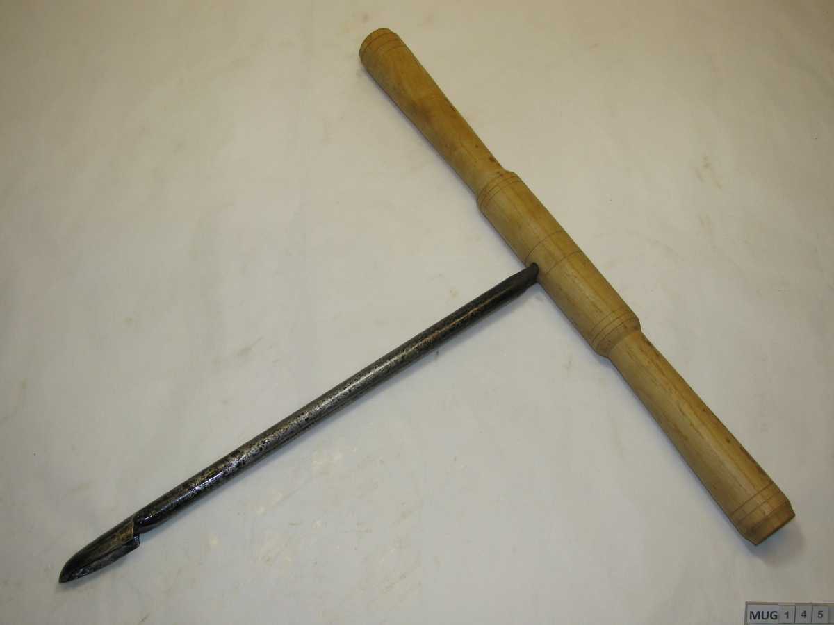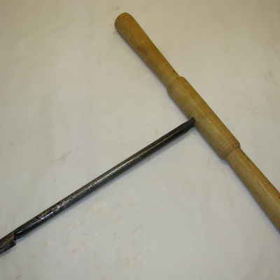 Ronde ijzeren steel met kleine boor en rond (nieuw) houten handvat. Zwart, blank.