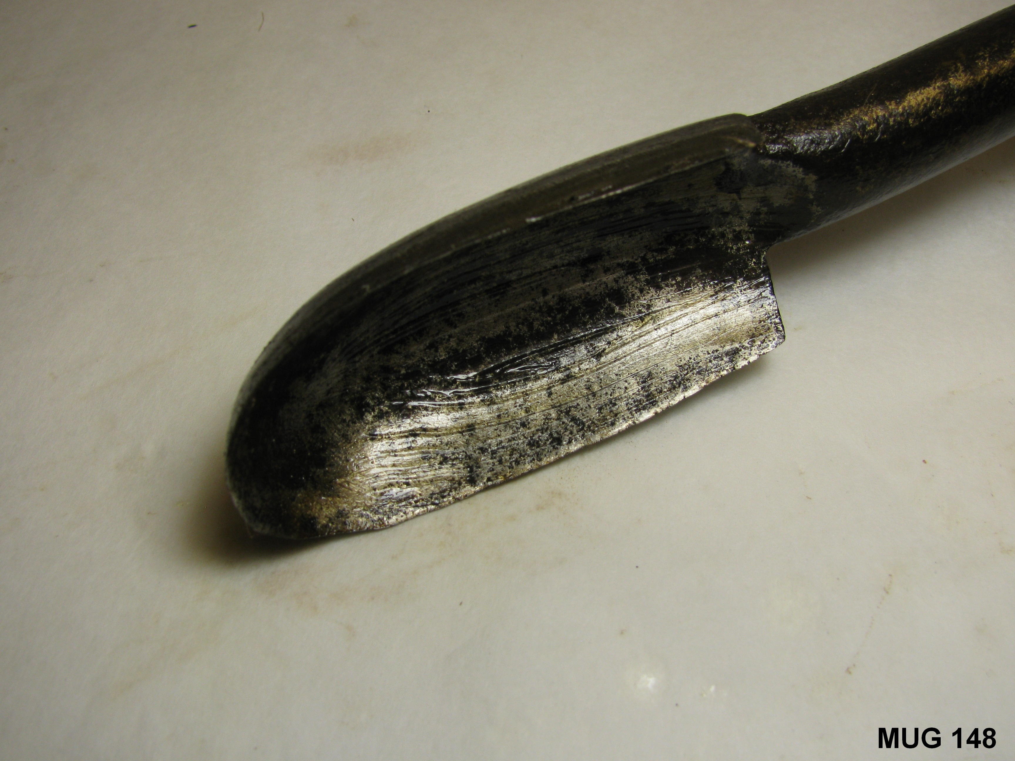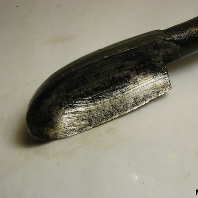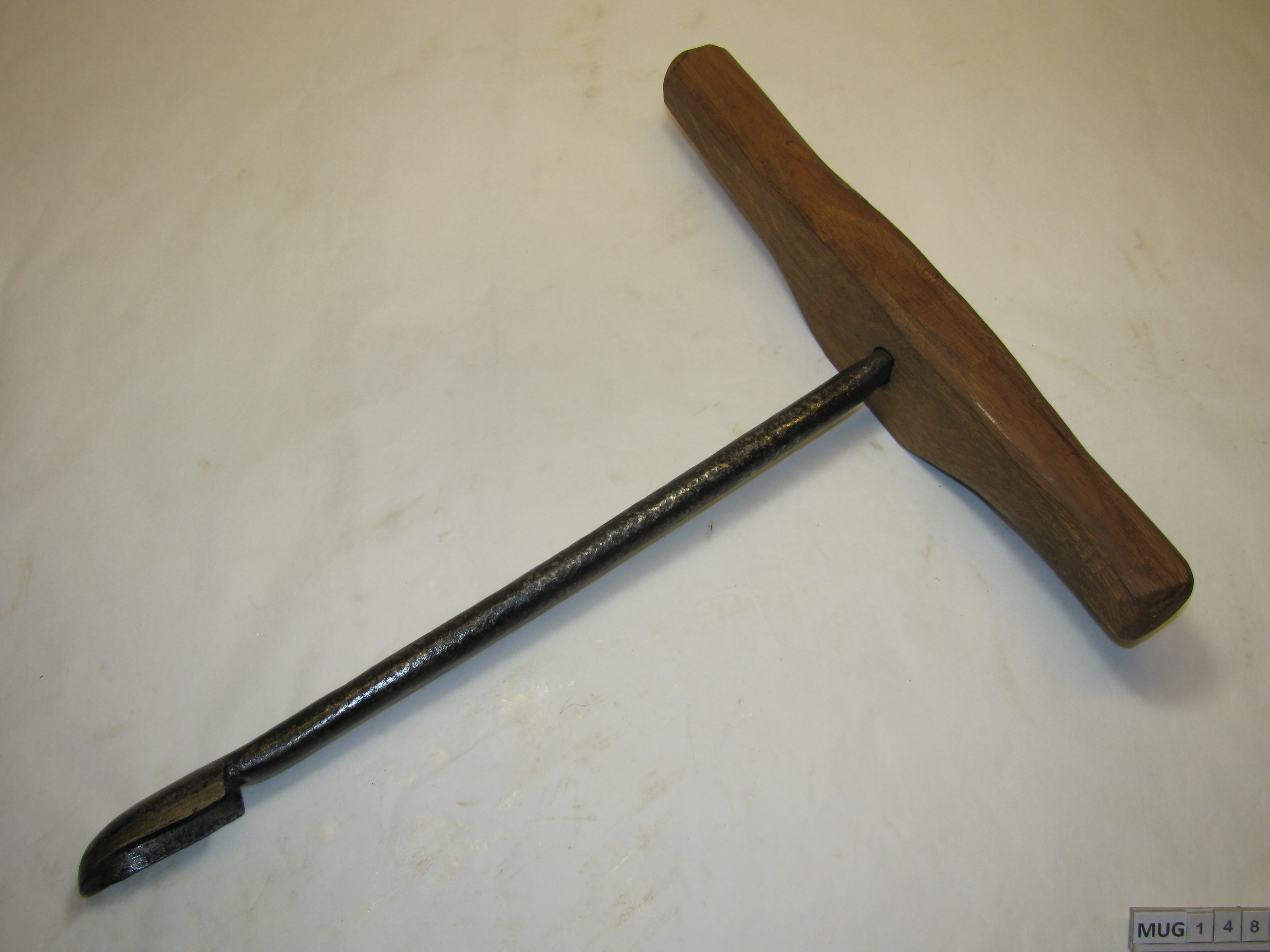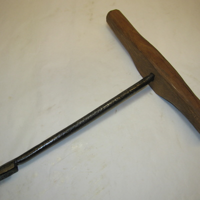 Ronde ijzeren steel met lepelboor en fors (nieuw) houten handvat. Zwart, bruin.