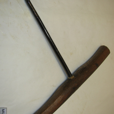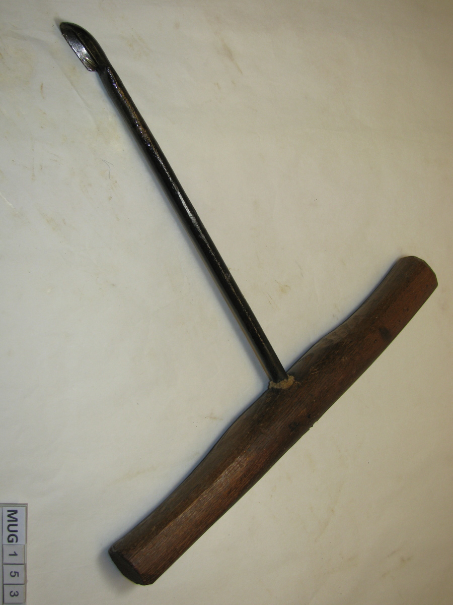 Ronde ijzeren steel met kleine lepelboor en rond houten handvat. Zwart, bruin.