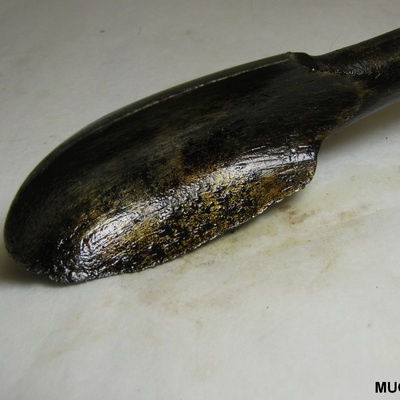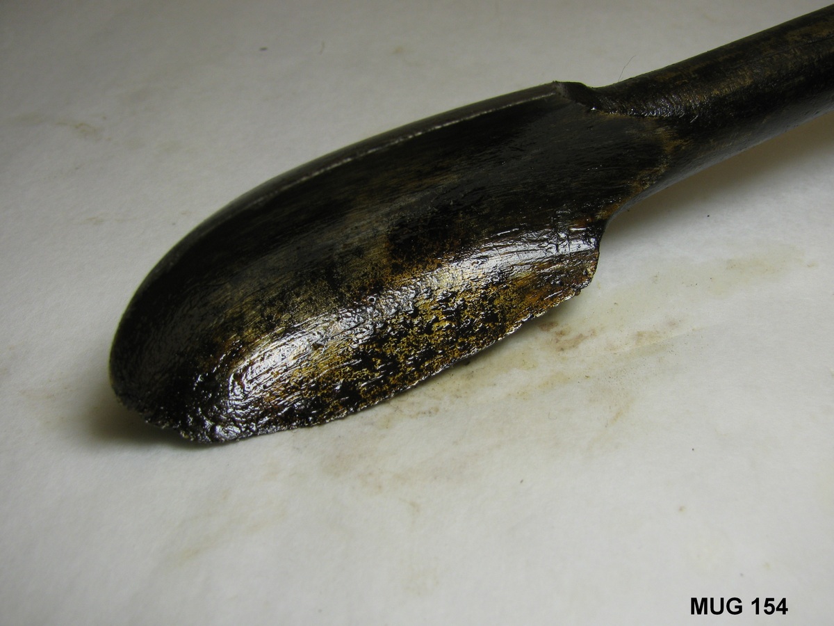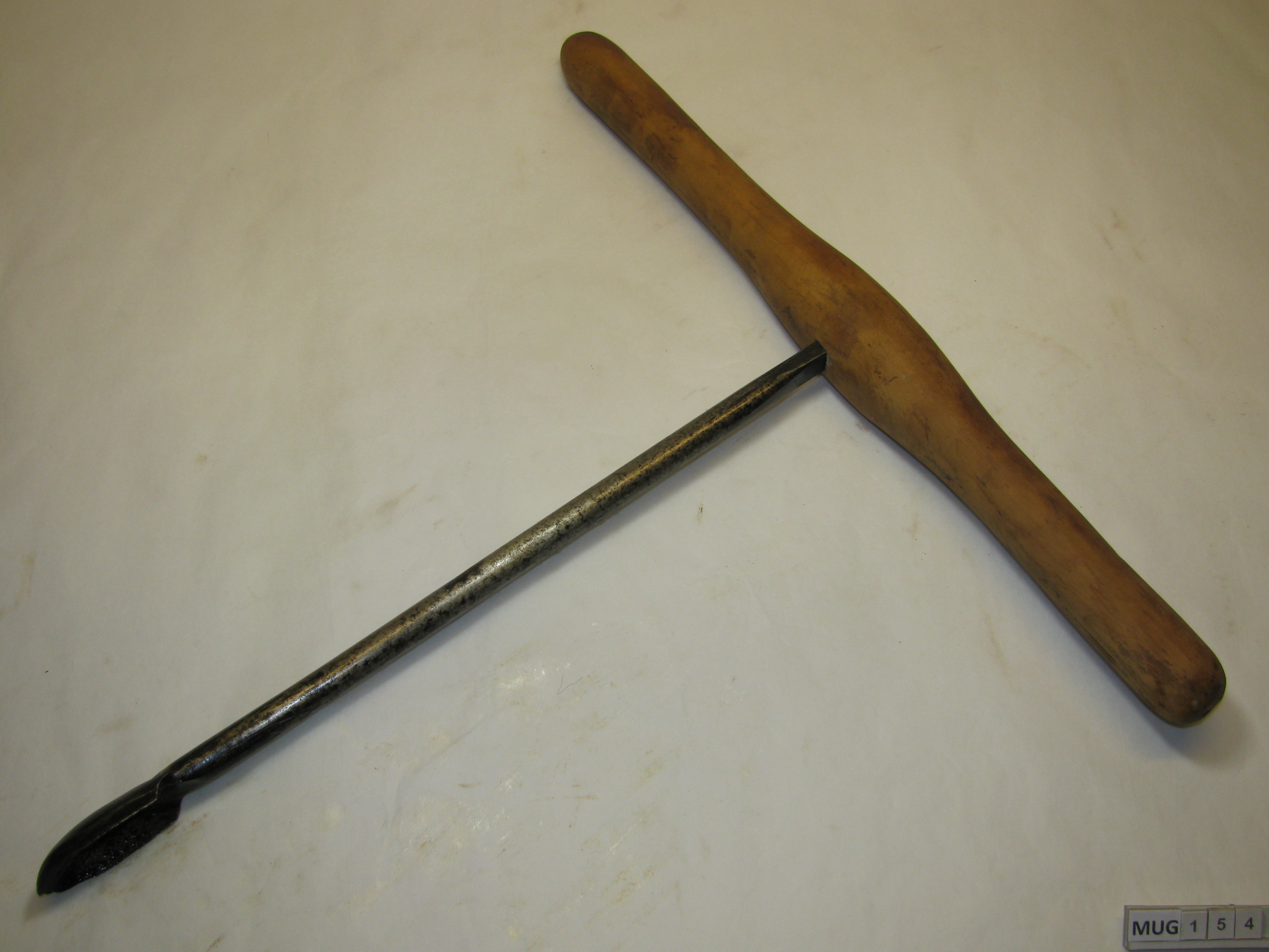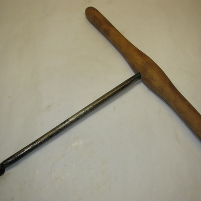 Ronde ijzeren stang met lepelboor en rond houten handvat (nieuw). Op steel: 4RE. Zwart, blank.