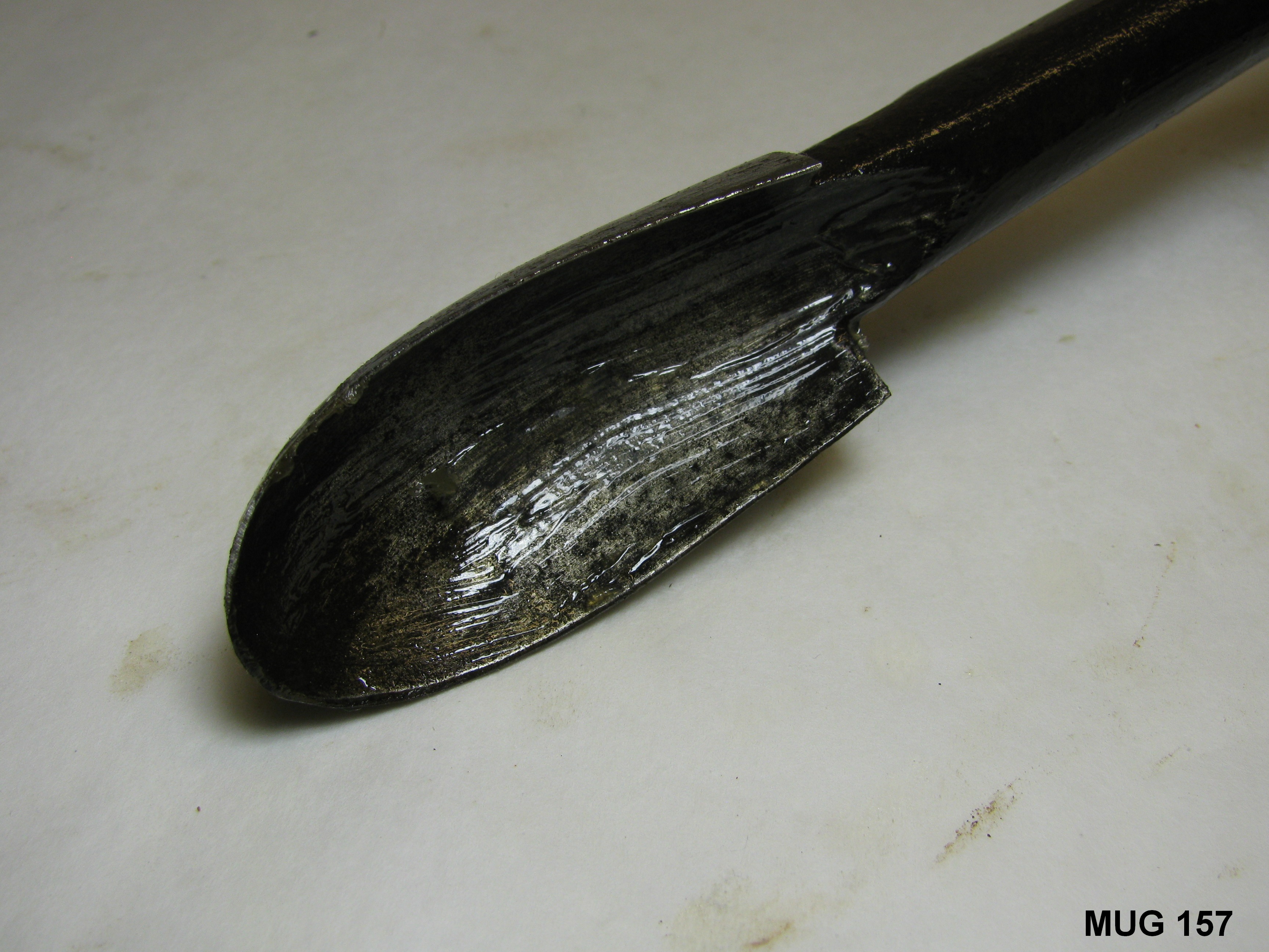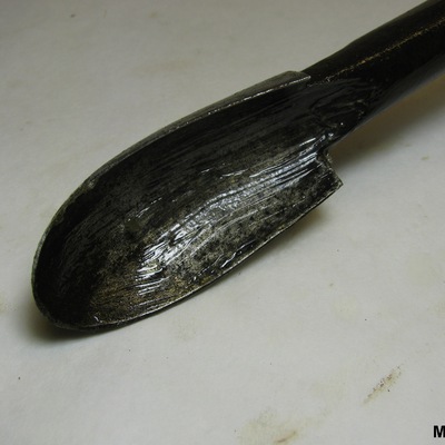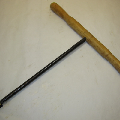 Ronde ijzeren stang met lepelboor en vernieuwd rond houten handvat. Zwart, blank.